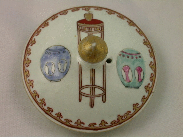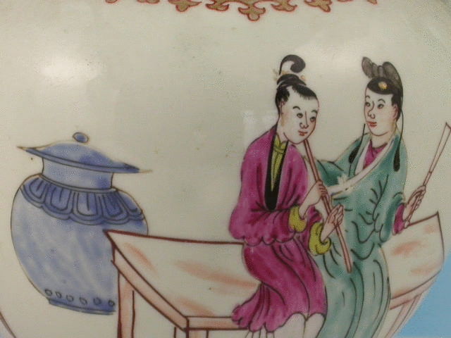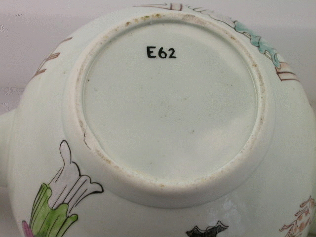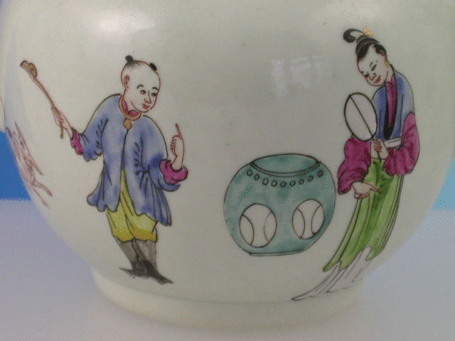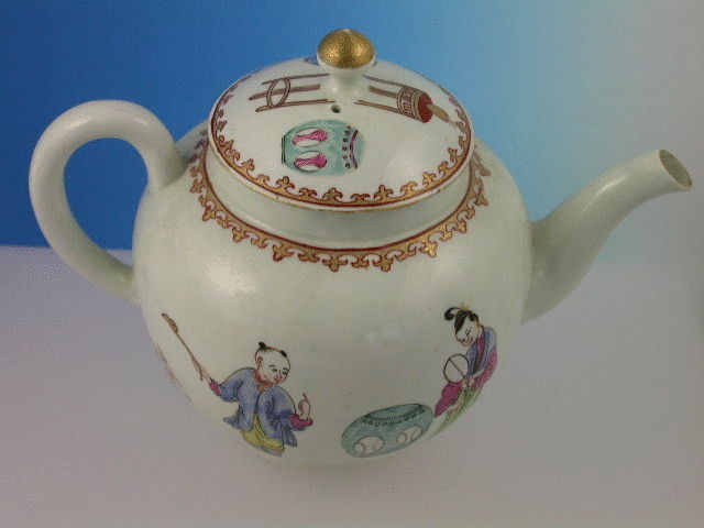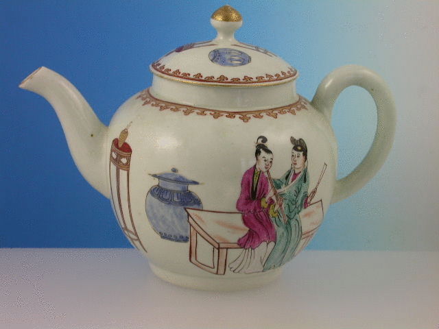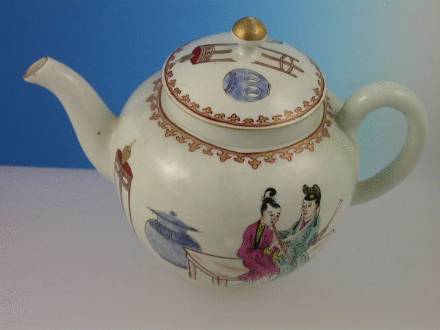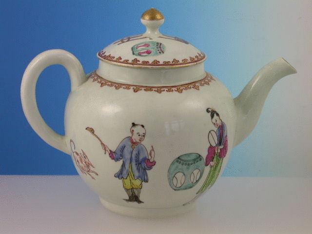 A rare Chaffers Liverpool globular Tea Pot and Cover , with mushroom finial, painted in polychrome enamels in Chinoiserie style with Chinese figures seated on a bench playing a musical instrument, the reverse with a child playing with a dog and standing by a garden seat. c1760.