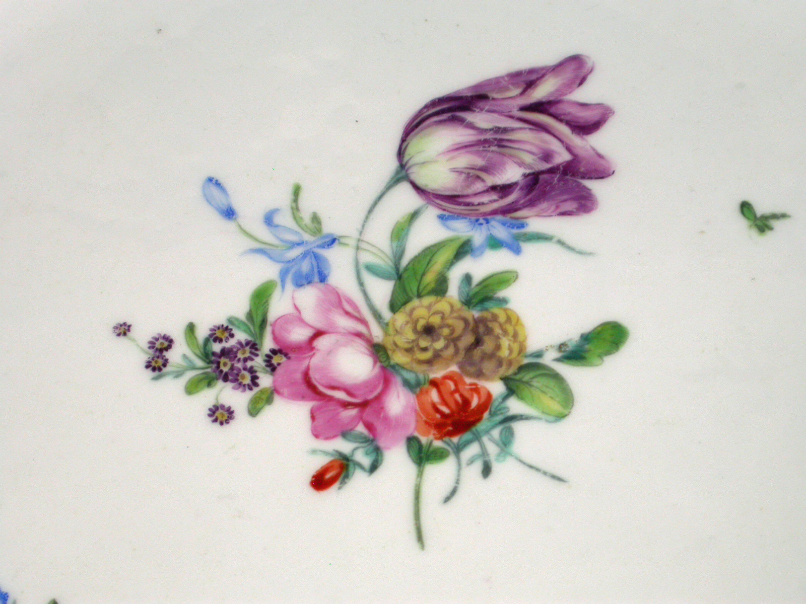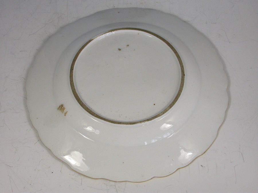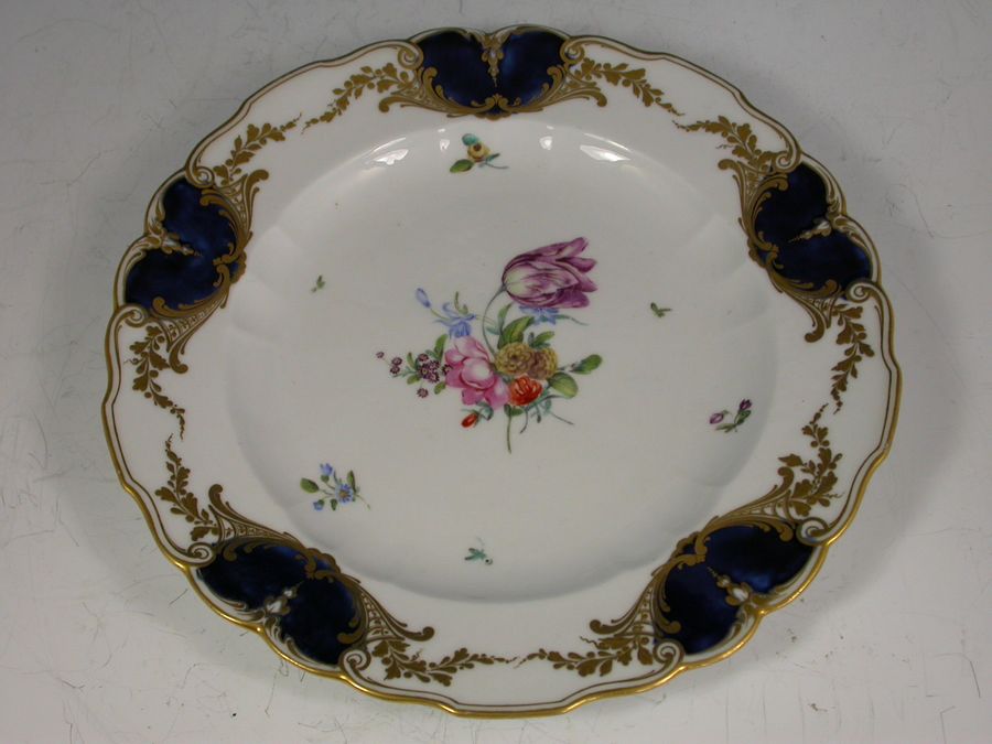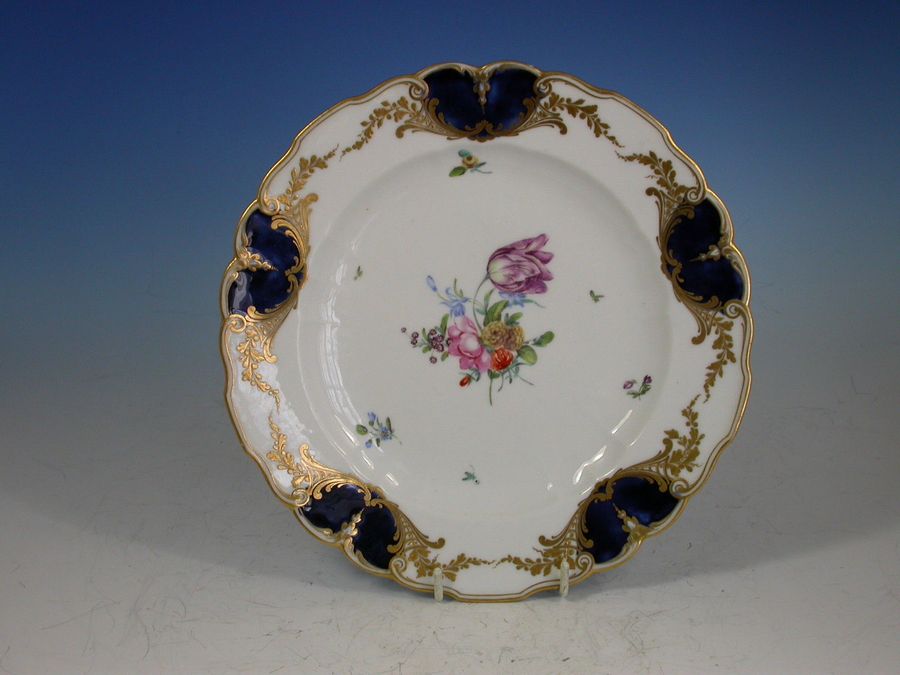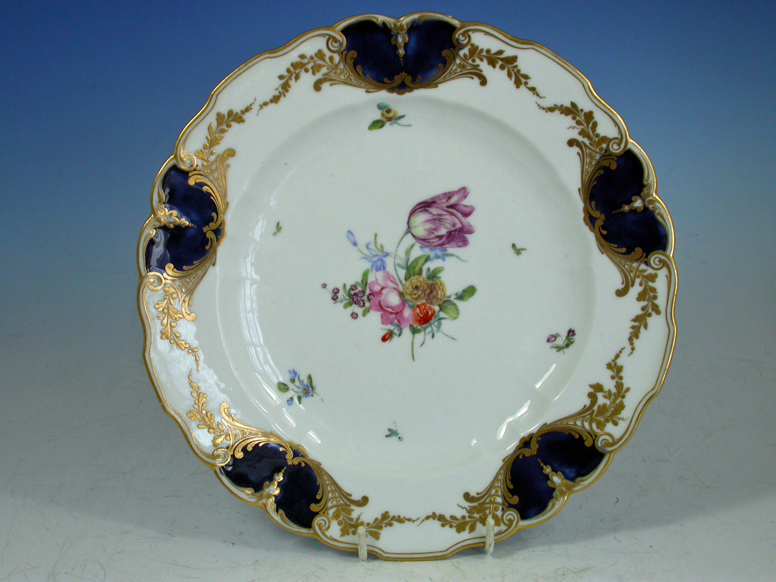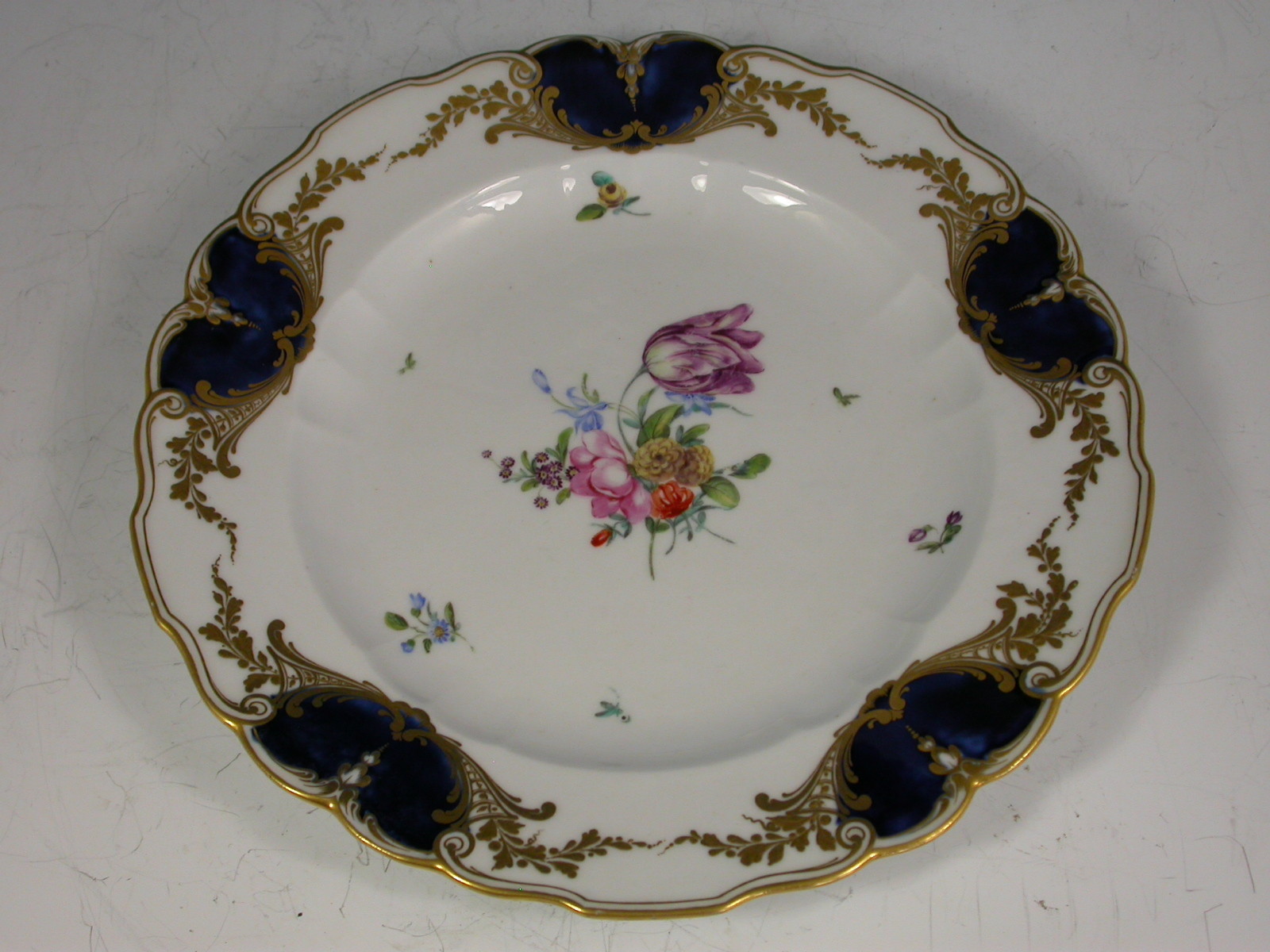 A rare Chelsea Gold Anchor Dessert Plate with lobed rims, painted in the central cavetto with a bouquet of English flowers and scattered sprays, all within gilt enriched mazarine blue mirror shape reserves, pendant swag gilt line rims.