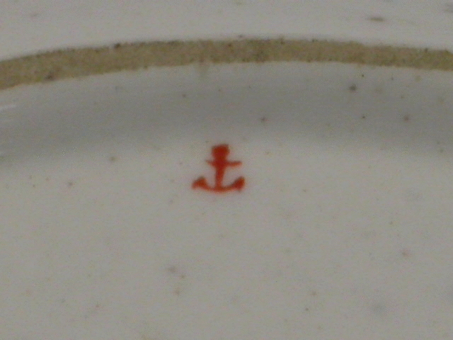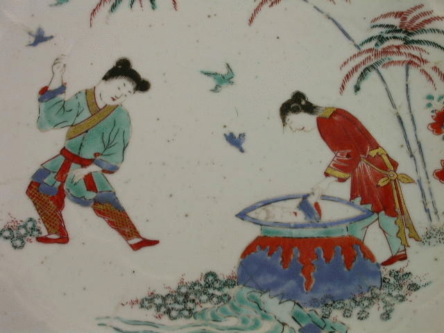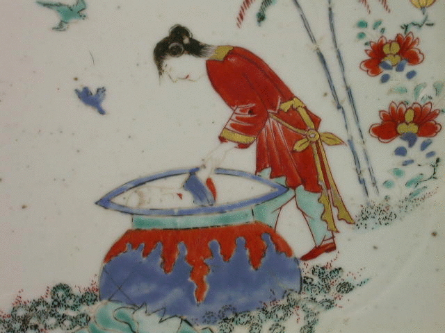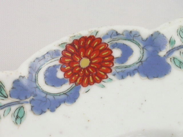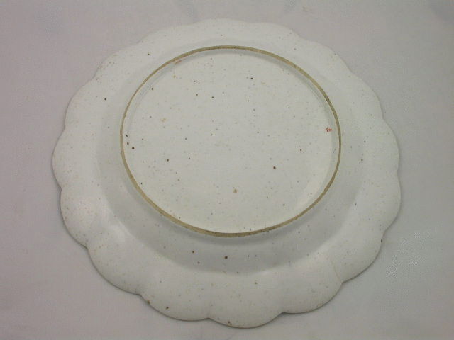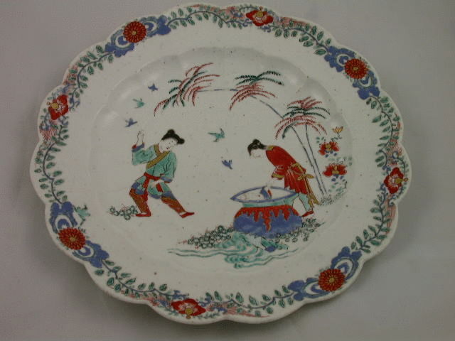 A good Chelsea Raised / Red Anchor period “Hob in the Well” Plate with lobed crenulated border, painted in Kakiemon style and taken from the original Chinese theatrical scene, within a border of brick red chrysanthemums and blue trailing foliate sprays. c1754.