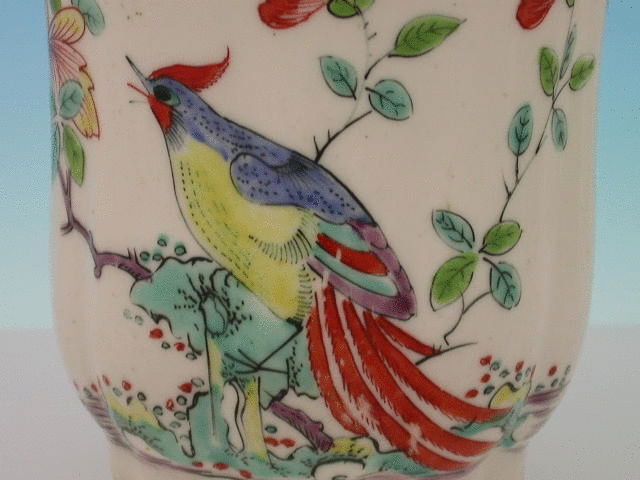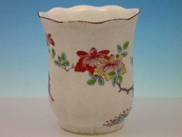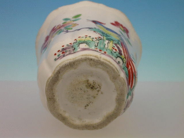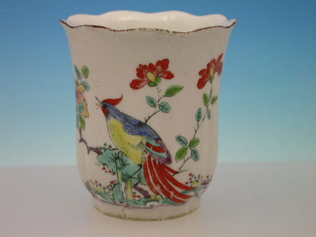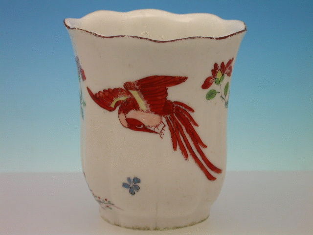 A fine Chelsea Raised Anchor tall Beaker of moulded faceted form, painted in onglaze enamels with the Ho Ho Bird decoration in prunus blossom and with a phoenix type bird in the reserve, all within chocolate line border. c1748-50. Unmarked.
