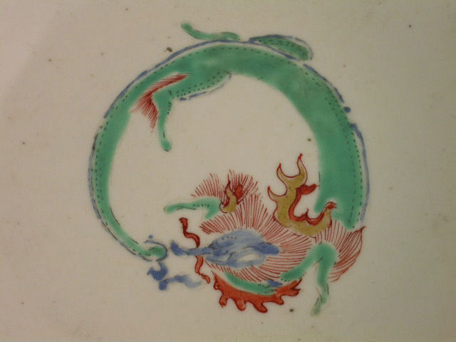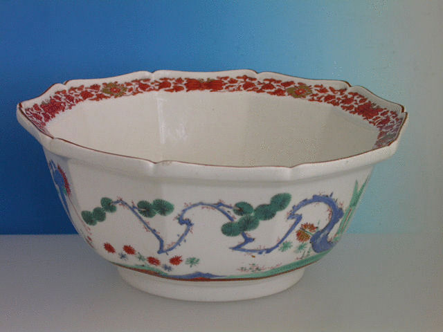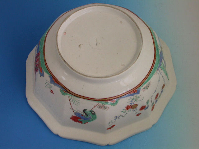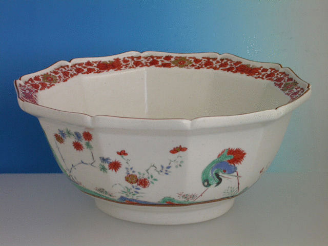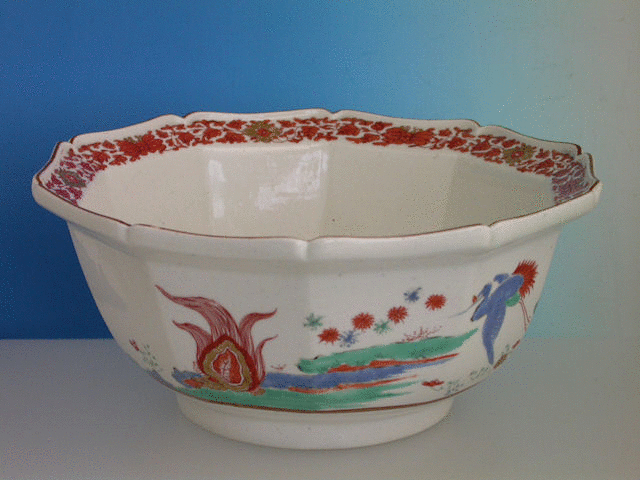 A very fine Chelsea Raised Anchor lobed decagonal Bowl, painted in Kakiemon style with Cranes and Oriental symbols, a dragon to the interior base.