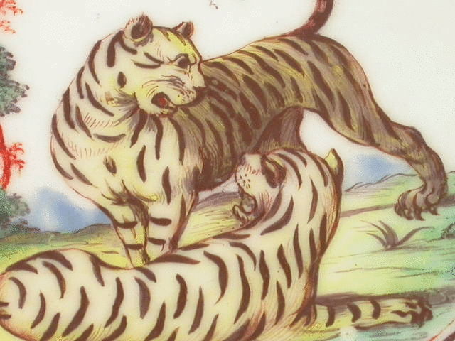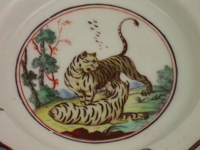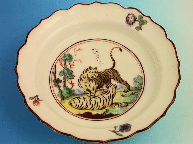 A fine early Chelsea Raised Anchor deep fluted Dish of small size, painted in the central circular reserve with two tigers playing on a rock, trees and flying birds in the background. Three floral sprigs to the border, chocolate line rims.