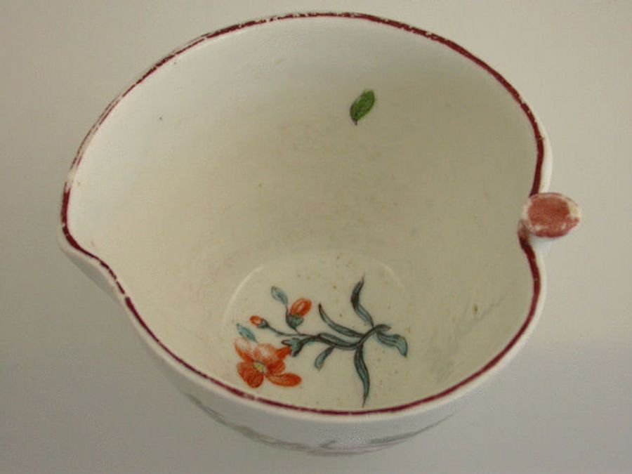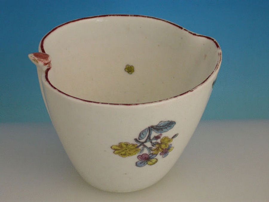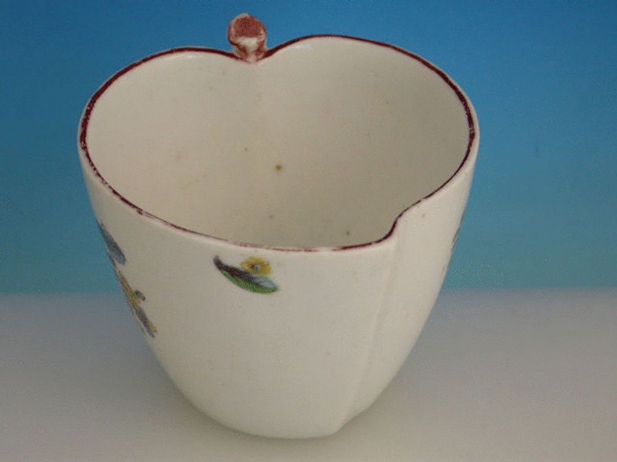 A rare Chelsea Raised Anchor Peach shaped Cup with moulded leaf handle, painted in the Vincennes style with sprays of flowers within chocolate line border to the rim.
