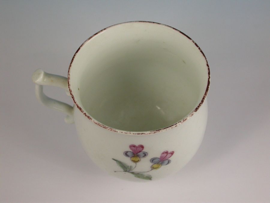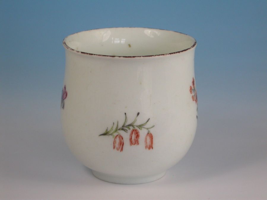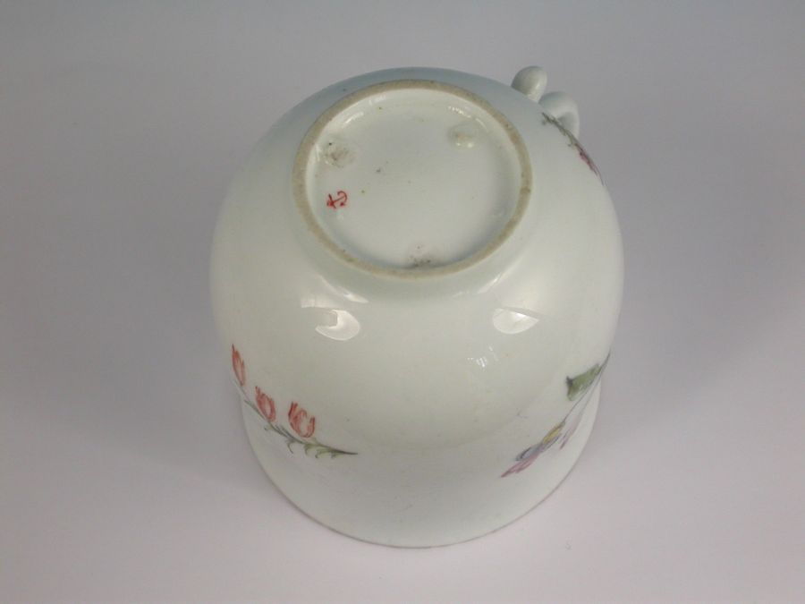 A good Chelsea Red Anchor bell shaped Coffee Cup with scrolled thumb piece handle, painted in polychrome enamels with a spray of English flowers and scattered sprigs and a chocolate line border to the rim.
