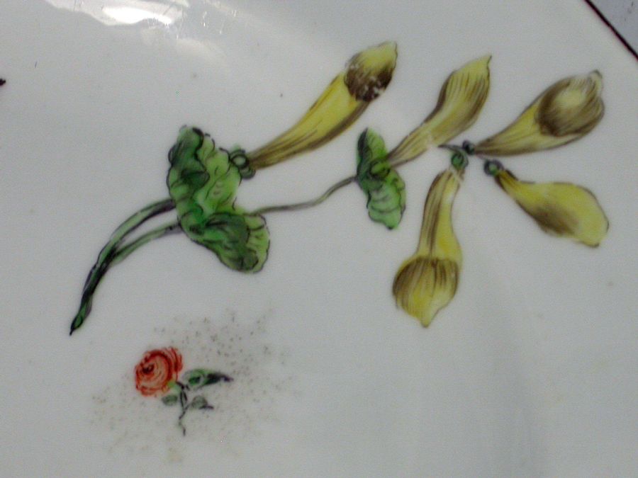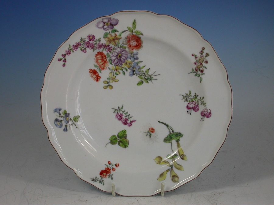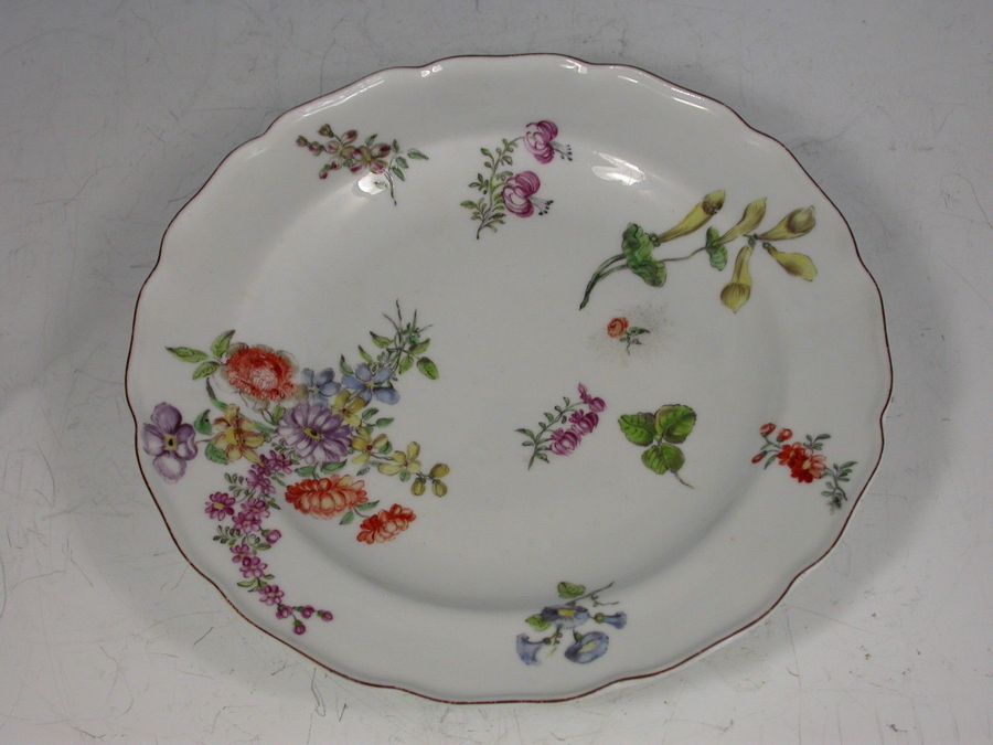 A fine Chelsea Red Anchor Dessert Plate with lobed rims, finely painted with bouquets of English flowers all within chocolate brown line rim.