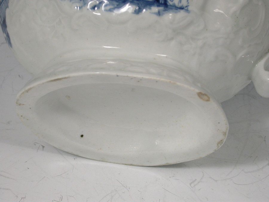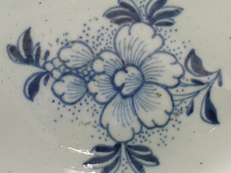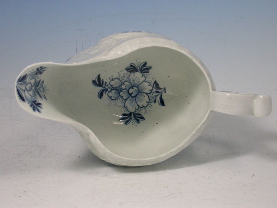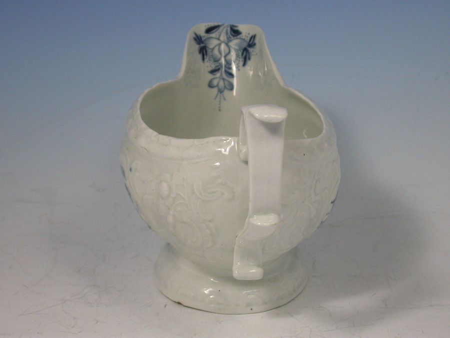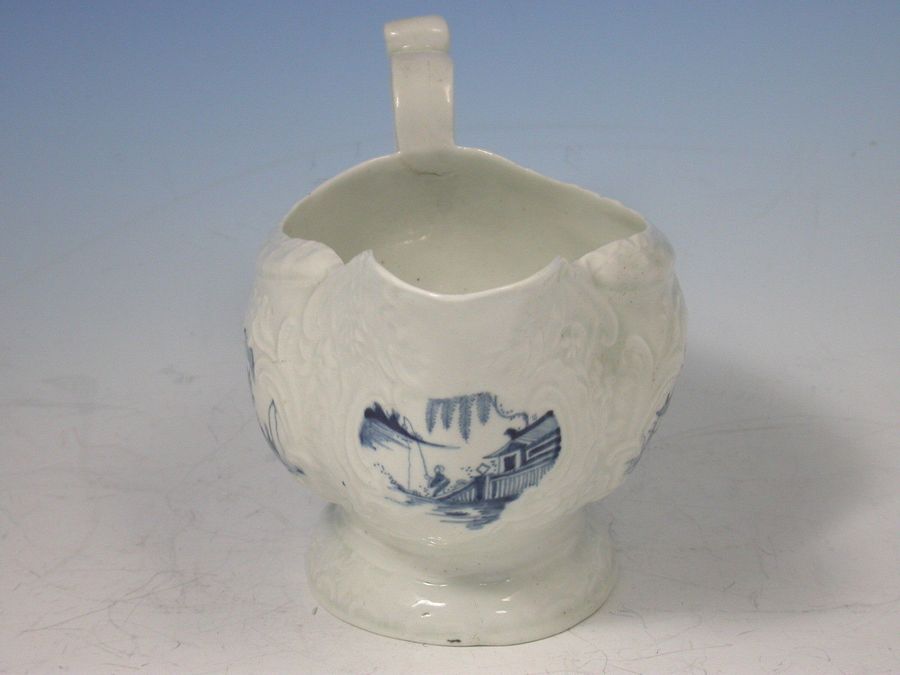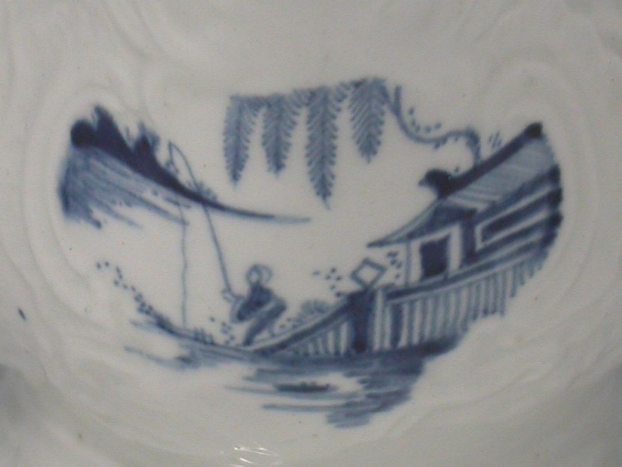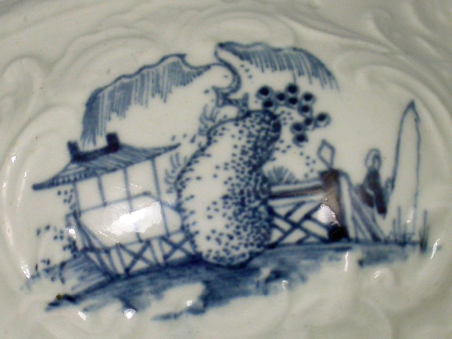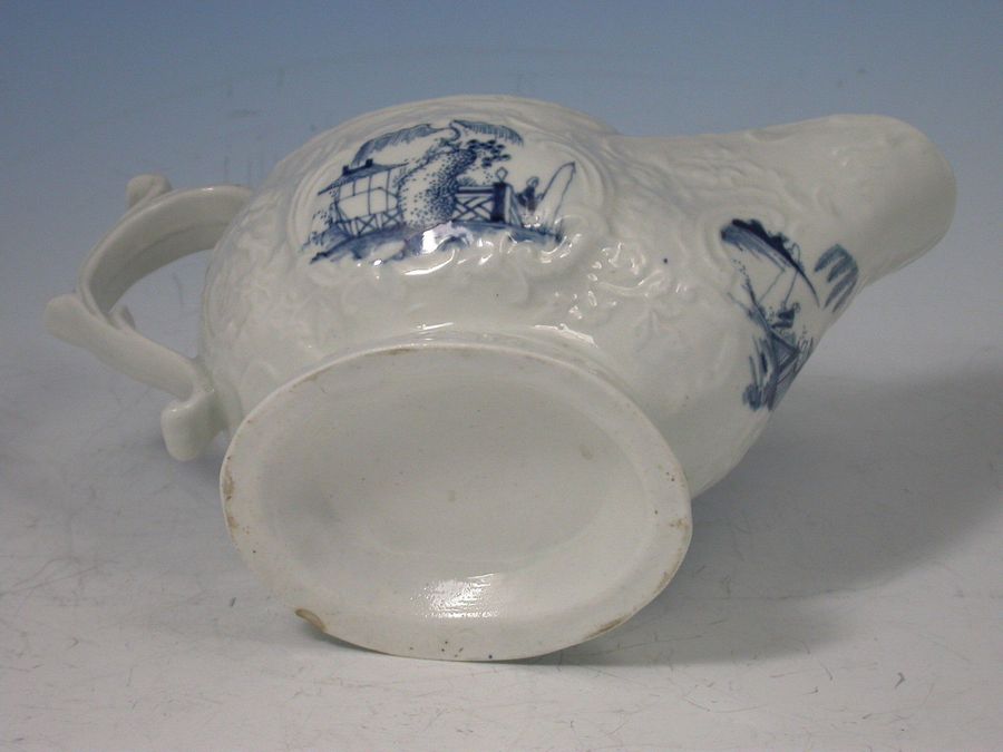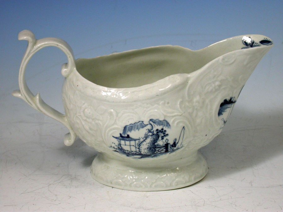 A rare Phillip Christian of Liverpool moulded Sauceboat with unusual scrolled handle, on oval pedestal foot, painted in the three mirror shaped reserves with ornamental fenced garden and lakeside scenes in underglaze blue, the interior with foliate sprays.