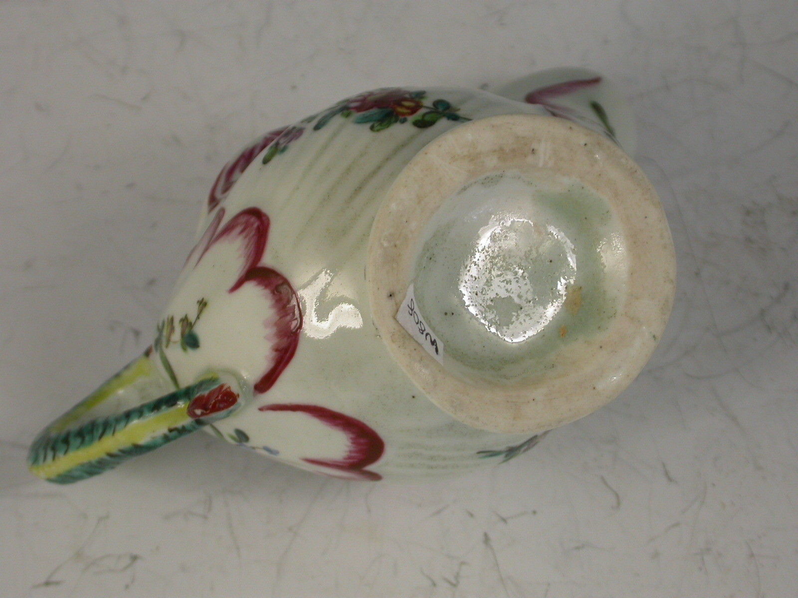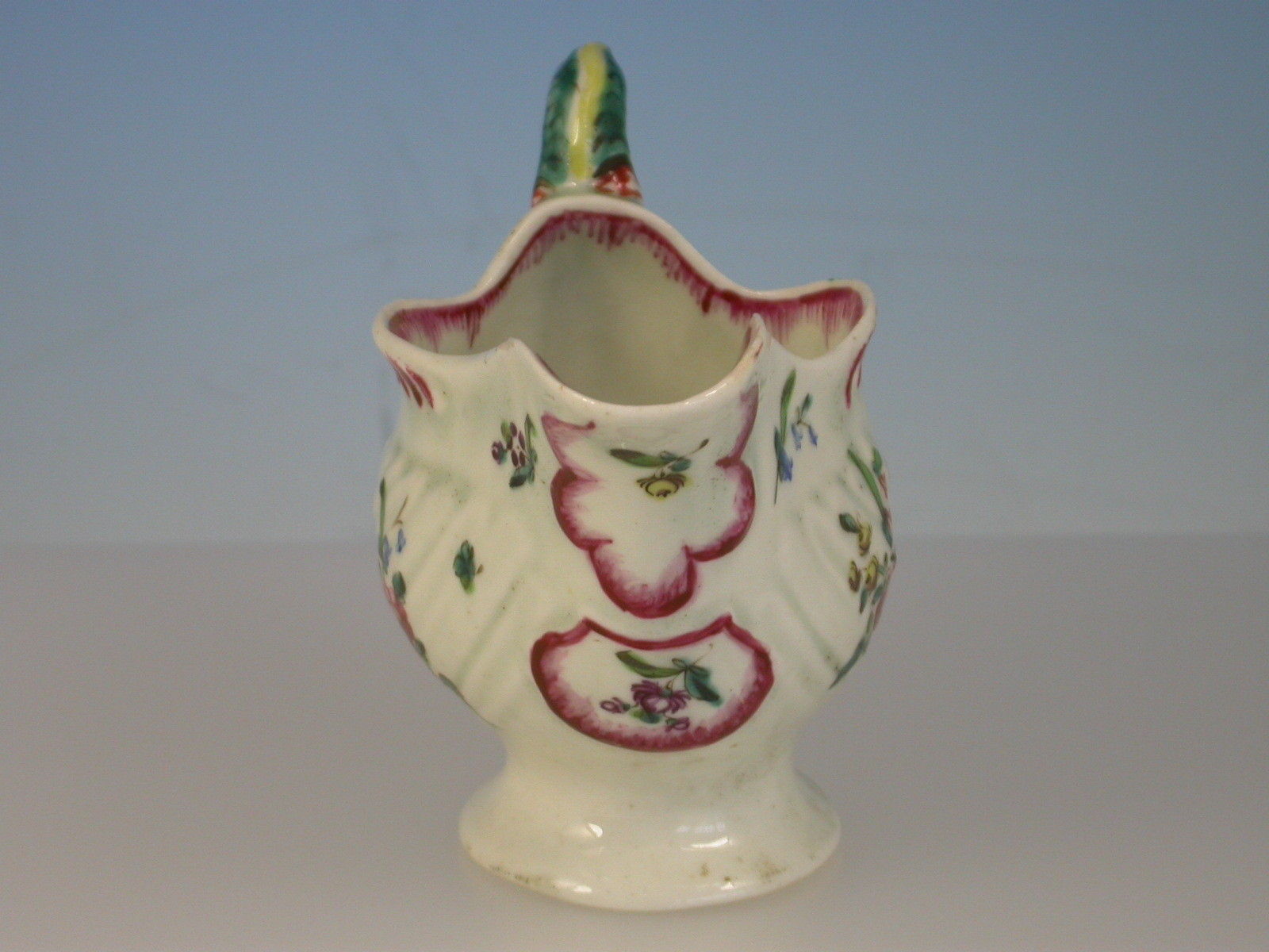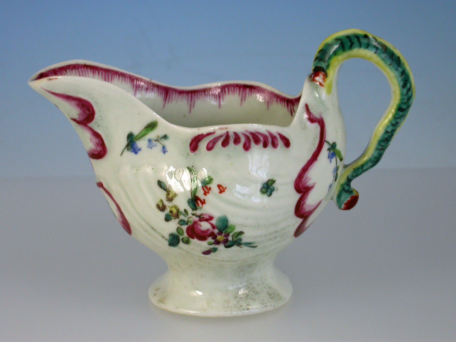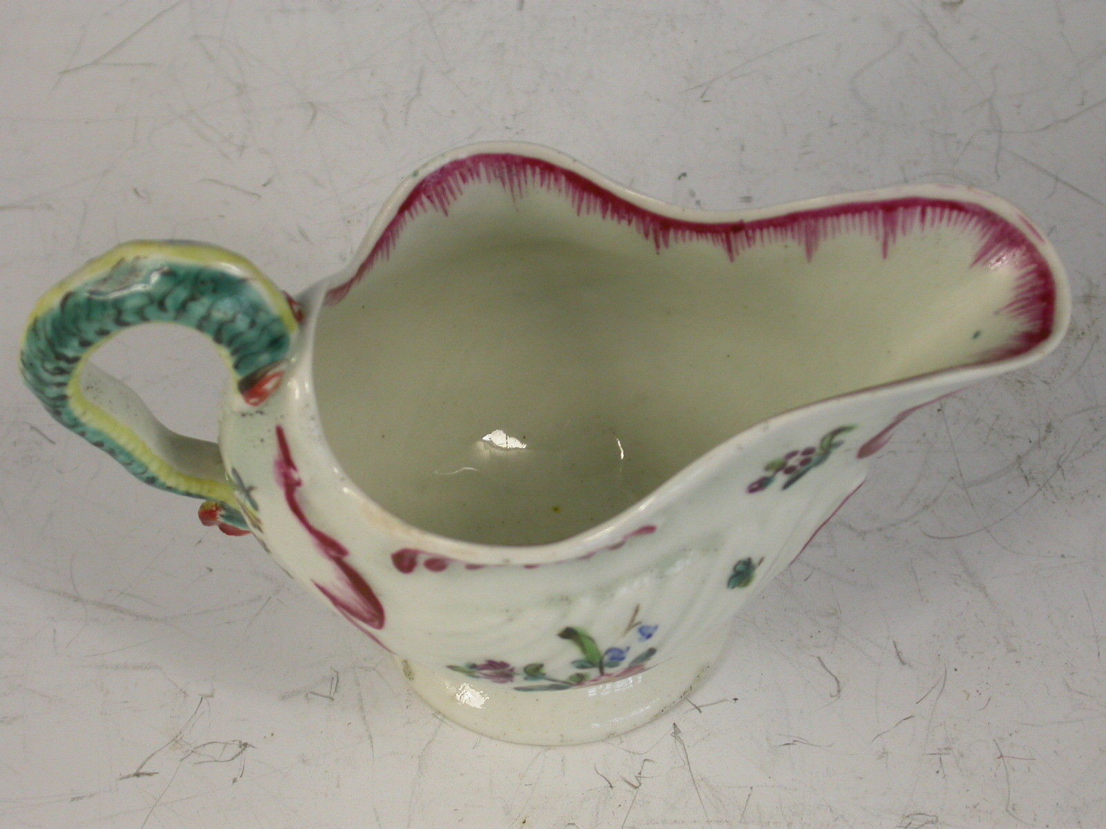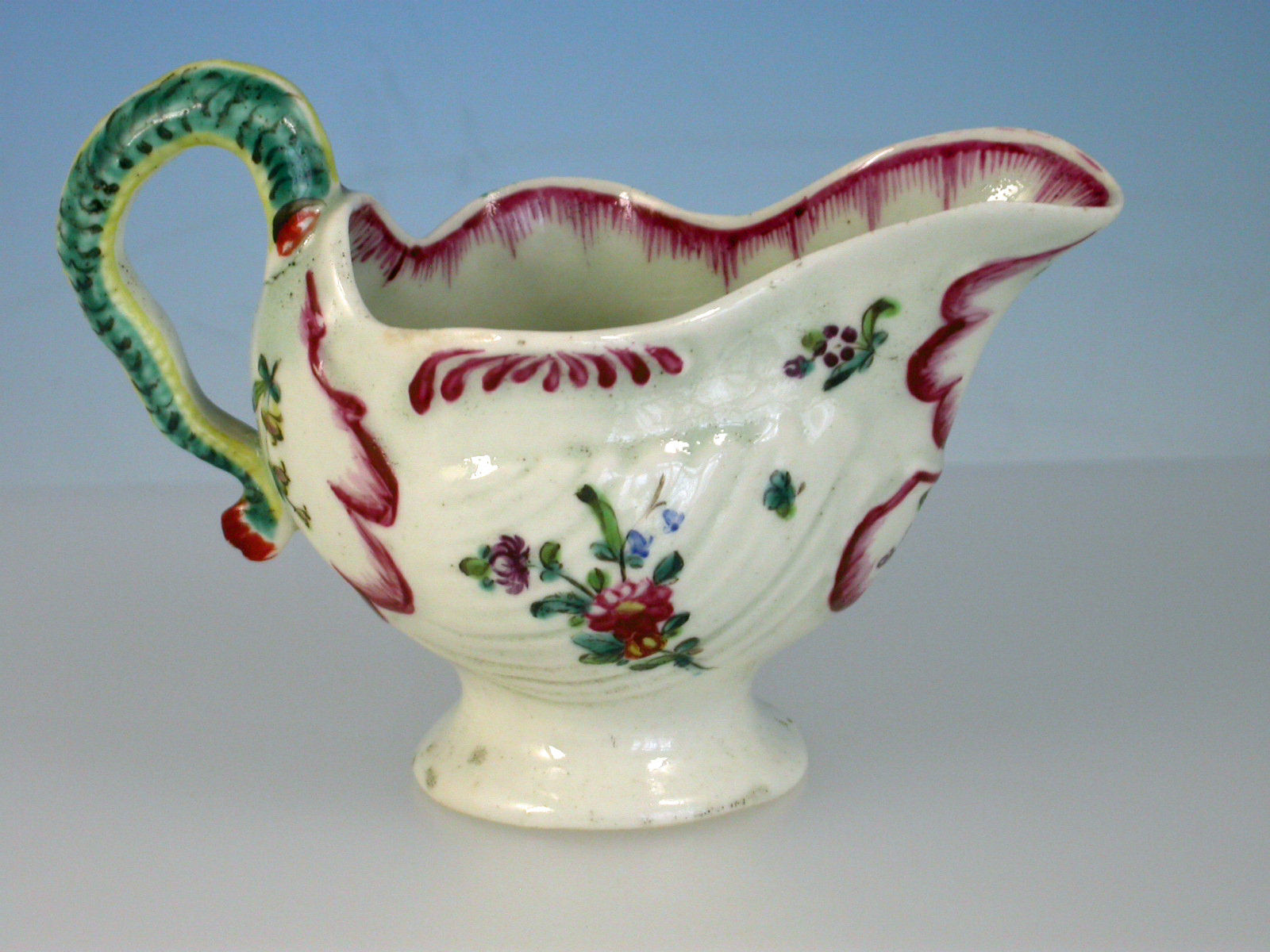 A rare Philip Christians Liverpool Dolphin Cream Boat with Lamprey handle, painted in polychrome enamels with sprays of flowers, the shell mouldings highlighted in puce carmine.