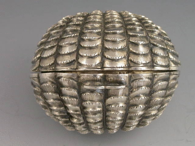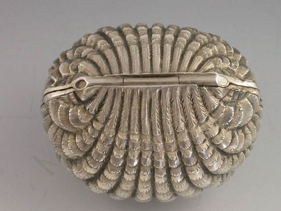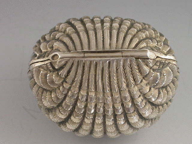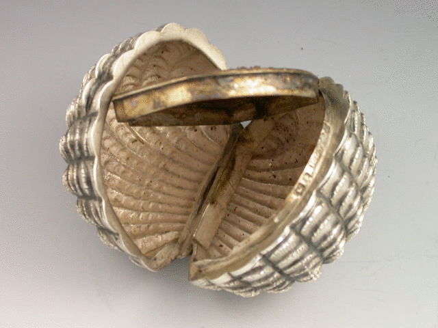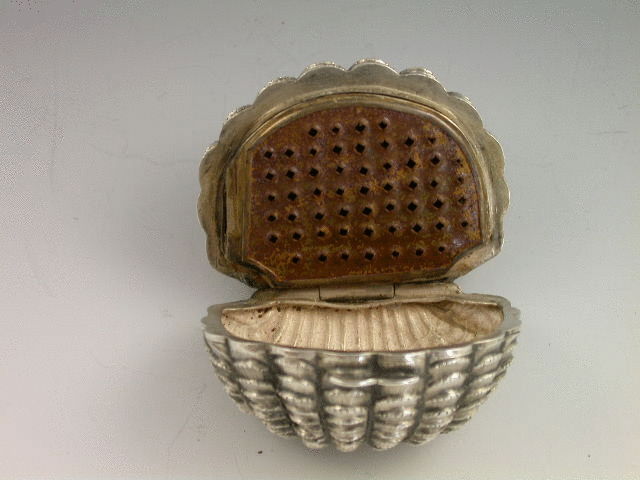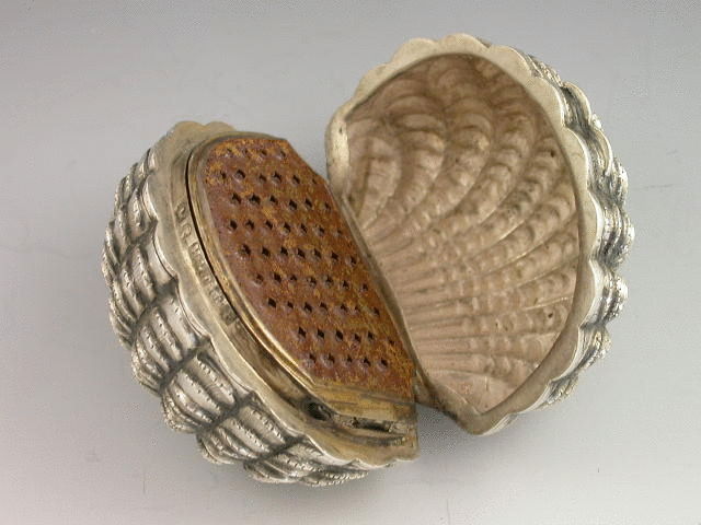 A very rare Victorian silver naturalistic Nutmeg Grater, realistically modelled as a clam shell, the hinged body opening to reveal the hinged metal grater.