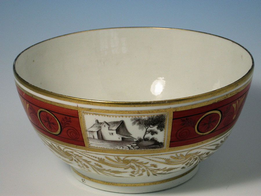 An unusual Coalport Bowl with orange banded decoration enclosing panels of roses, birds and a landscape scene.