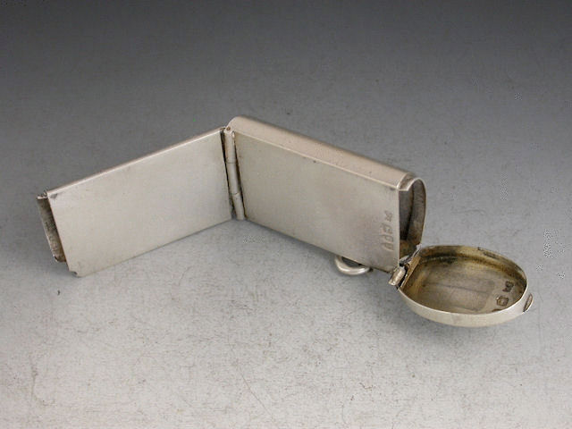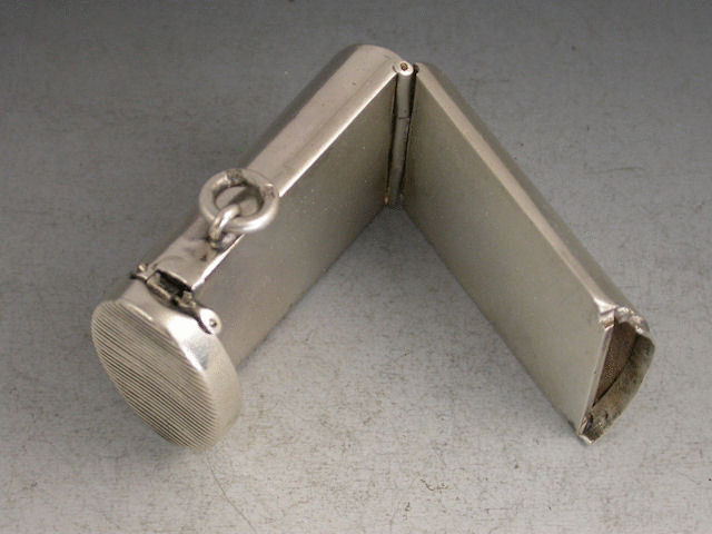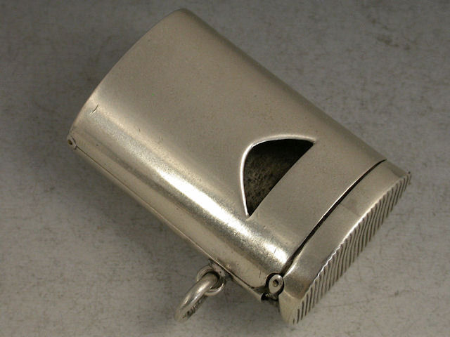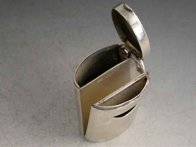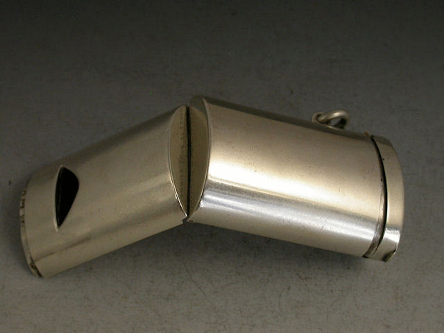 A rare Victorian Novelty silver Vesta Case combined with a Whistle, of oval tubular form splitting into two via a central hinge to the base, one half for vestas the other half forming the whistle, the oval hinged lid with strike plate holding the two together.