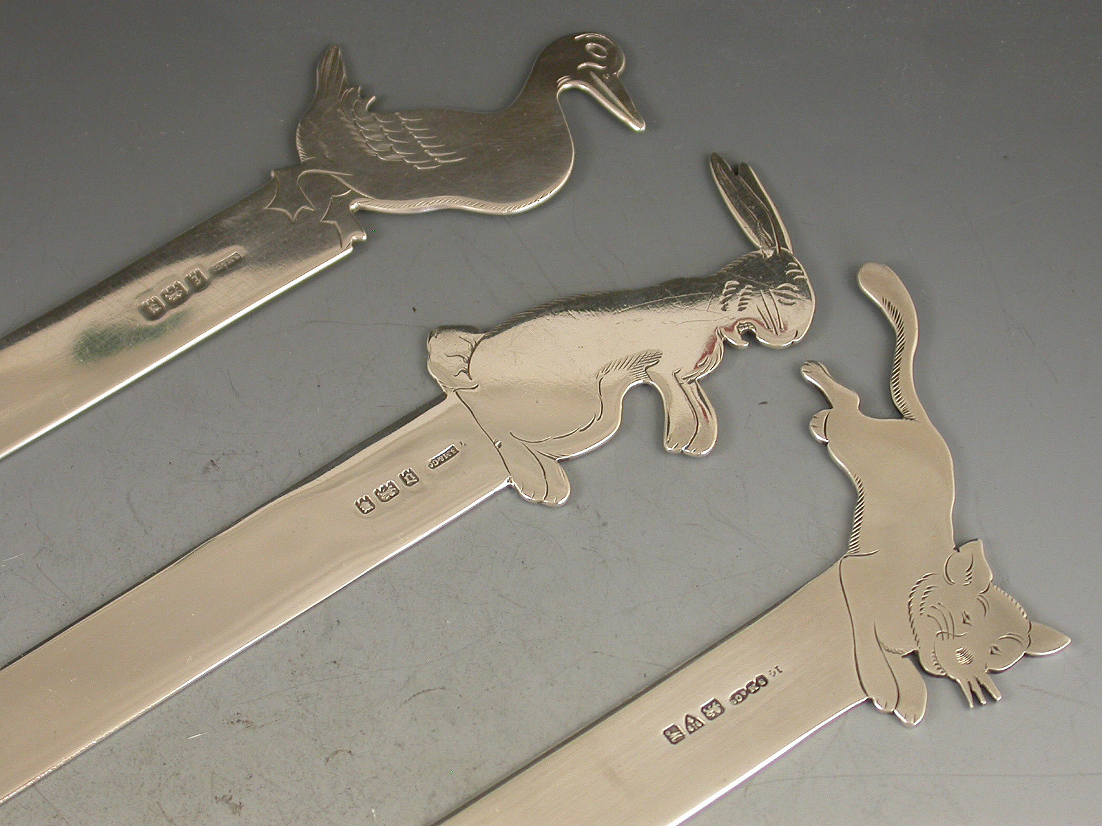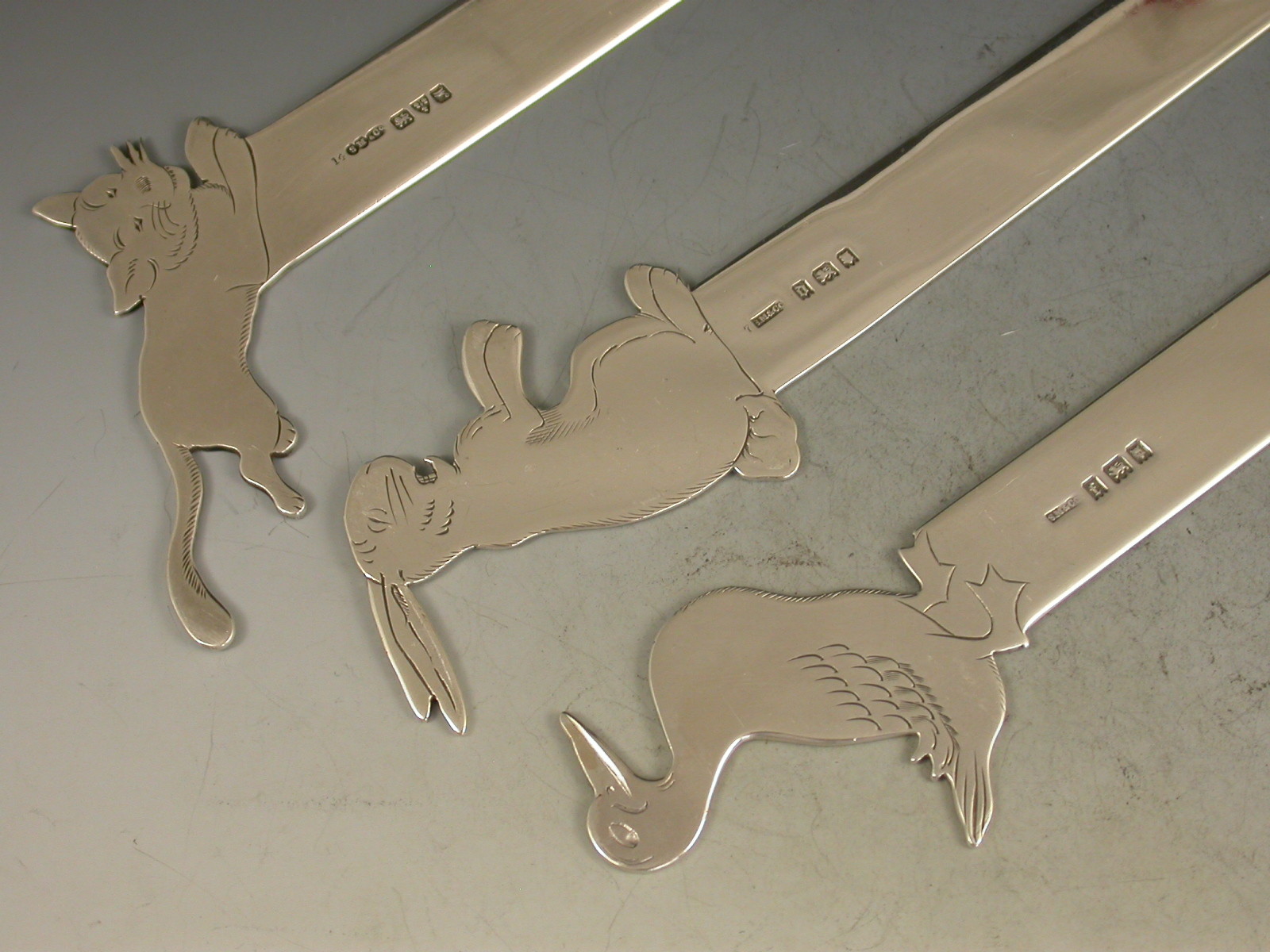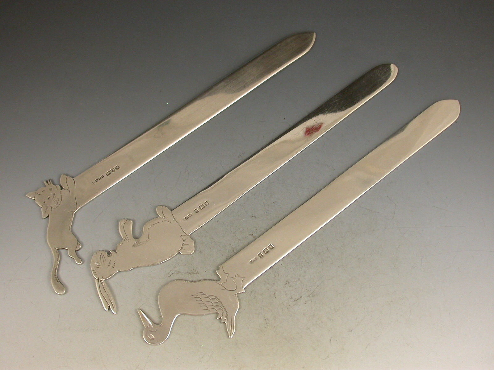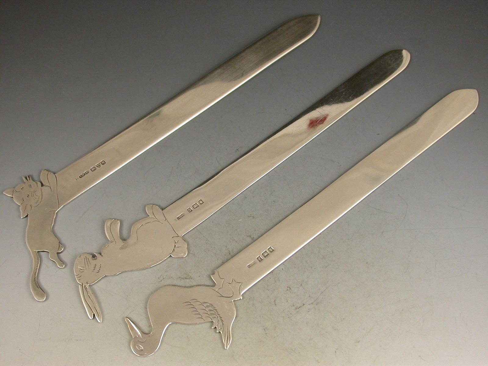A composed set of three early 20th century novelty silver Letter Openers, the terminals formed as a comical cat, duck and rabbit, after a design by Benjamin Rabier.