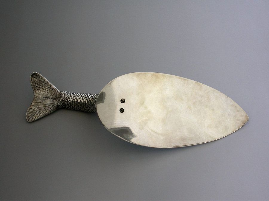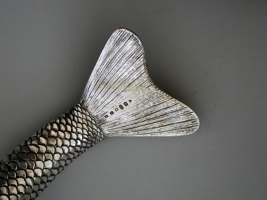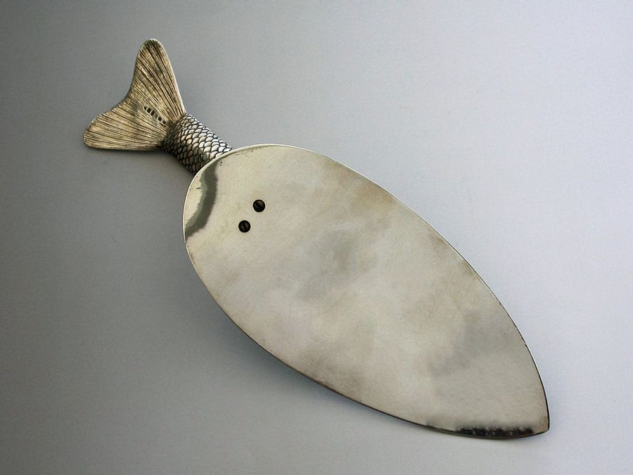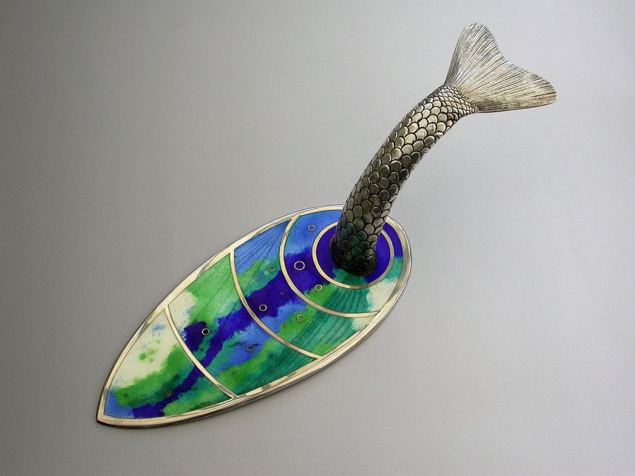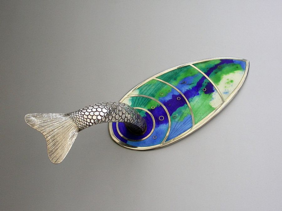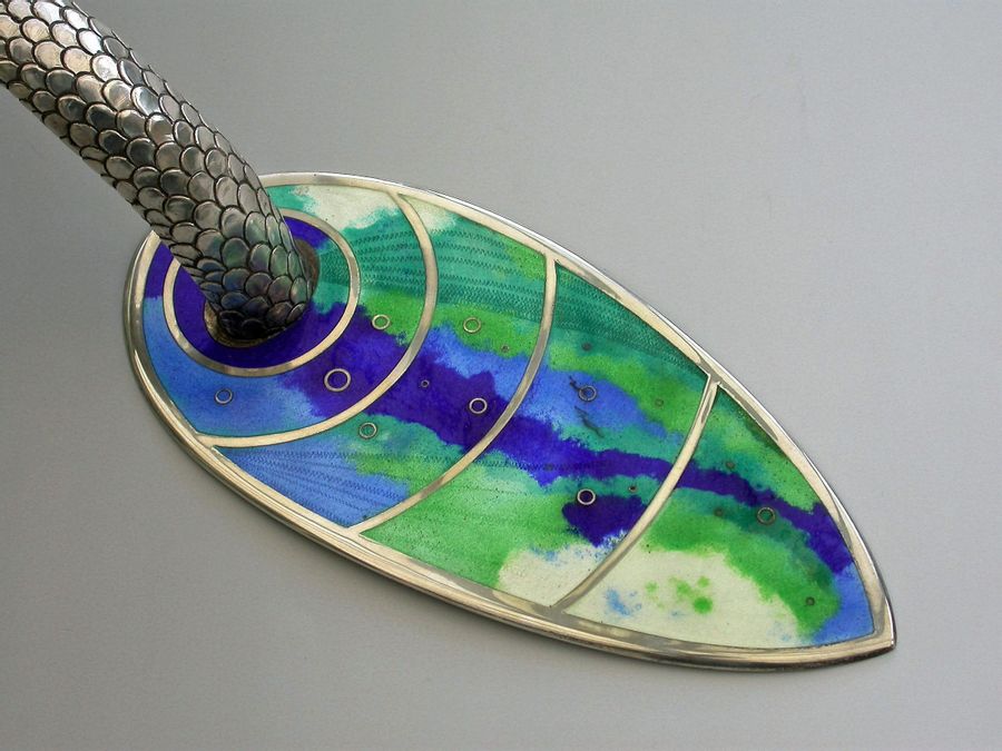 A stylish contemporary silver and enamel Fish Slice, the flat blade decorated in colourful blue, green and white enamel, the curved silver handle formed as a fish tail with realistic scale pattern.