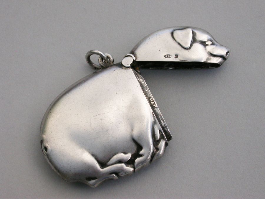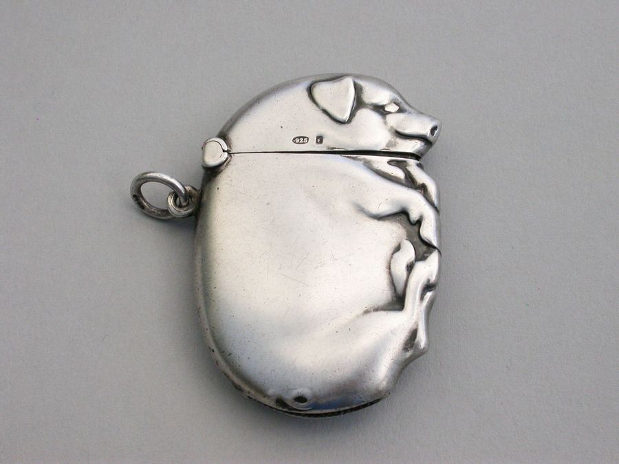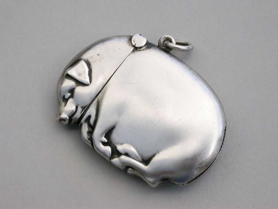 A good Edwardian Continental novelty silver Vesta Case made in the form of a flat sleeping pig, with hinged flip-top lid and attached suspension ring.