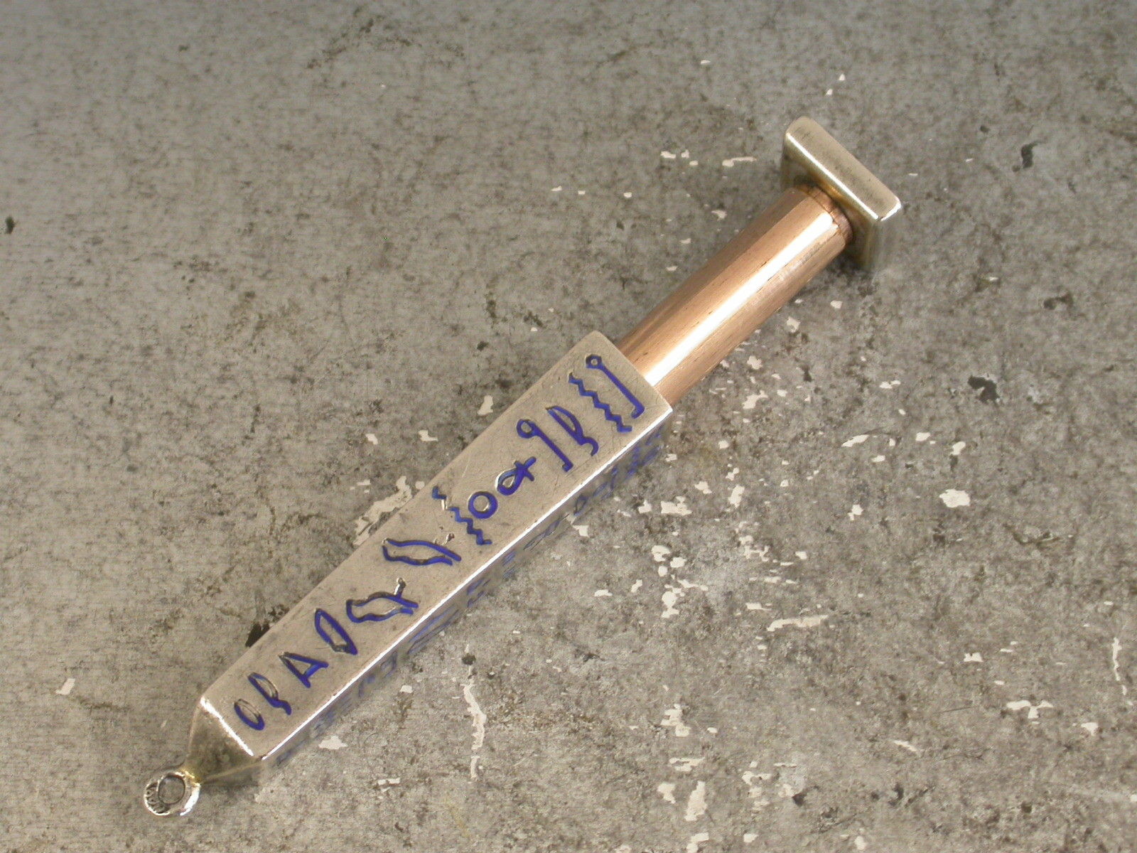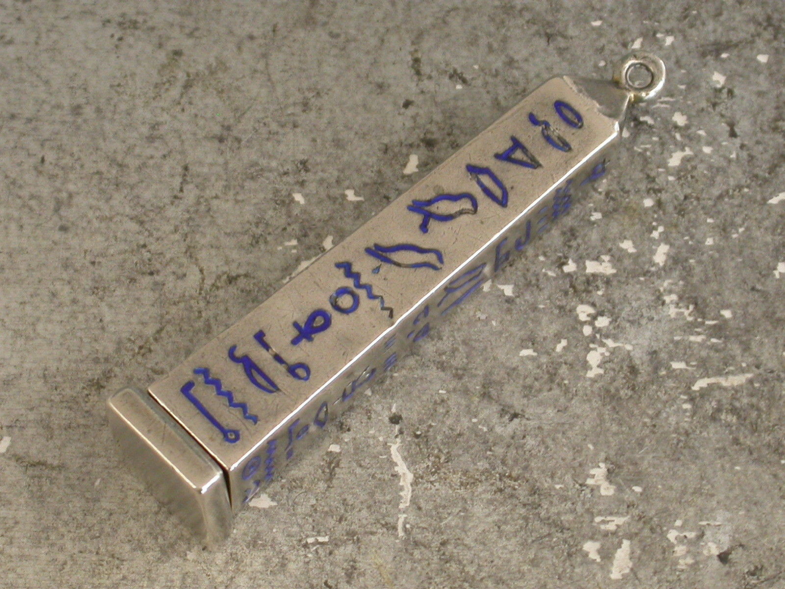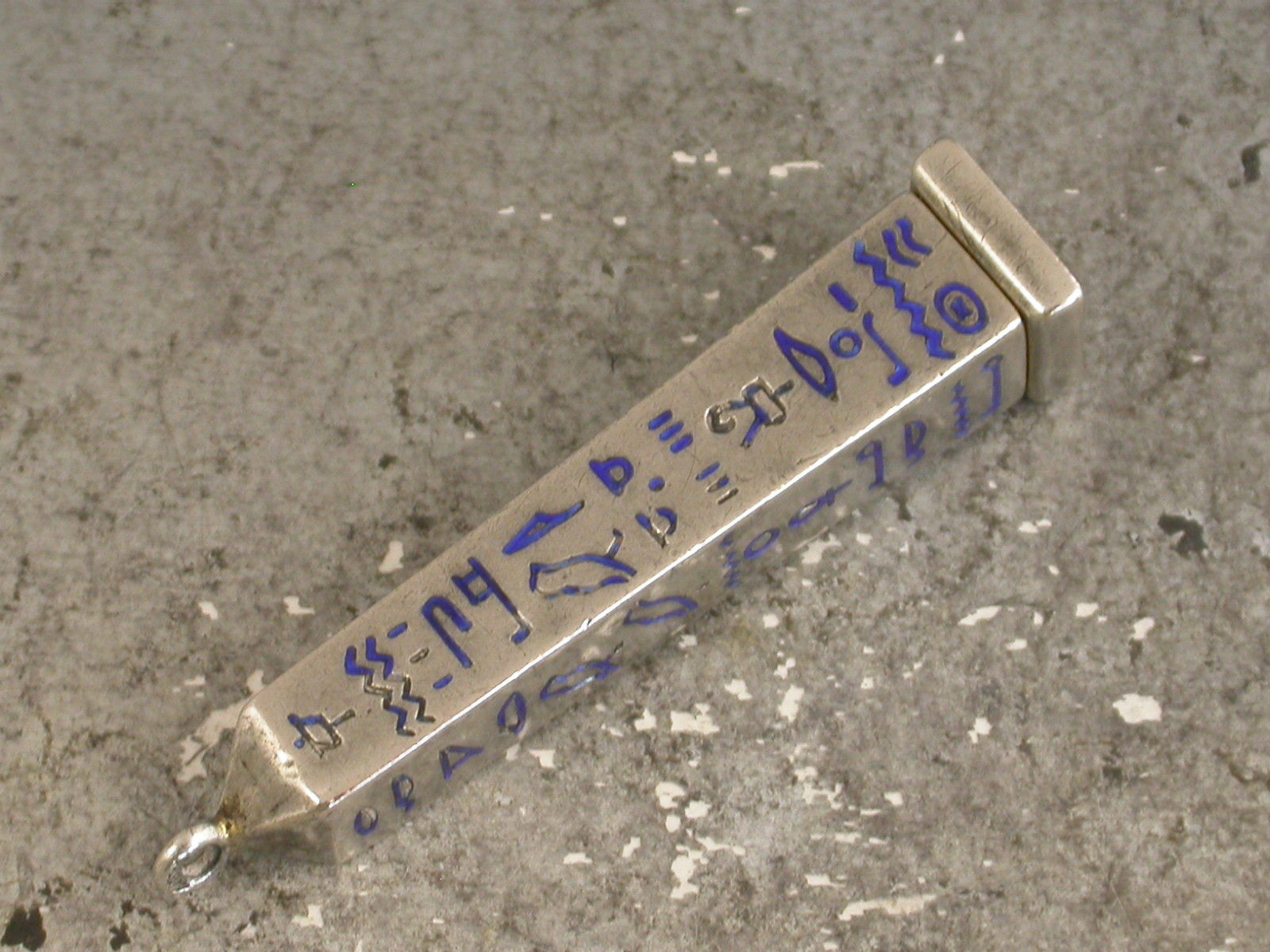 An early 20th century Continental silver and enamel novelty Propelling Pencil made in the form of an Obelisk or 'Cleopatra's Needle'. The body engraved with hieroglyphics highlighted in dark blue enamel, the pull out telescopic gilt metal pencil with square silver base.