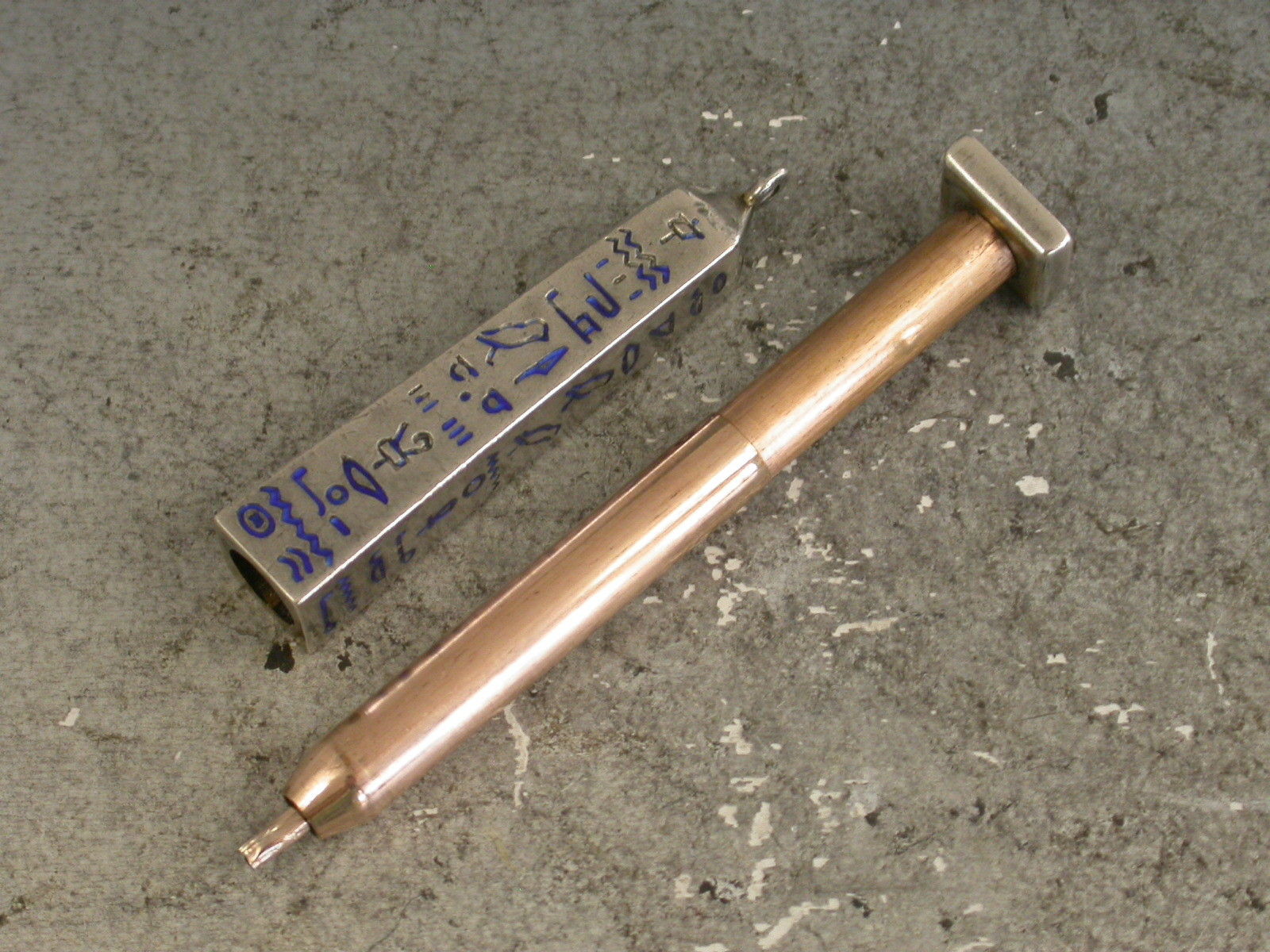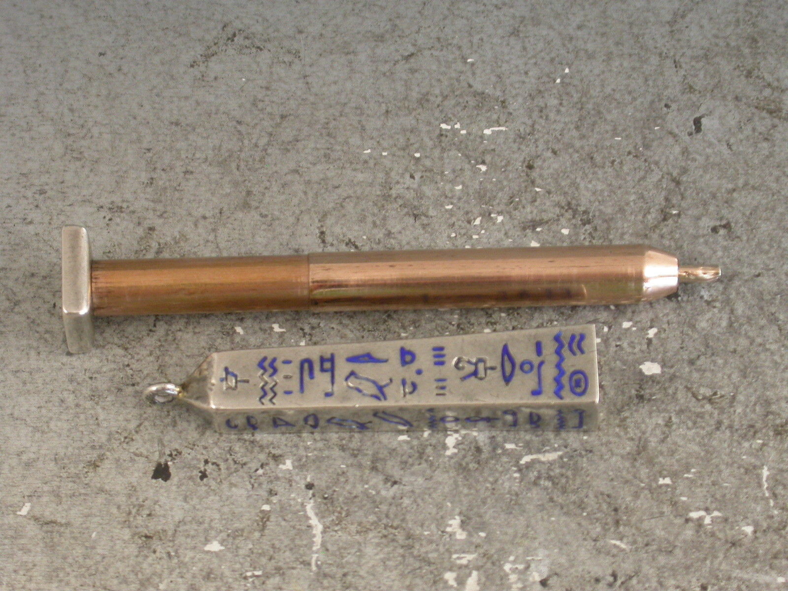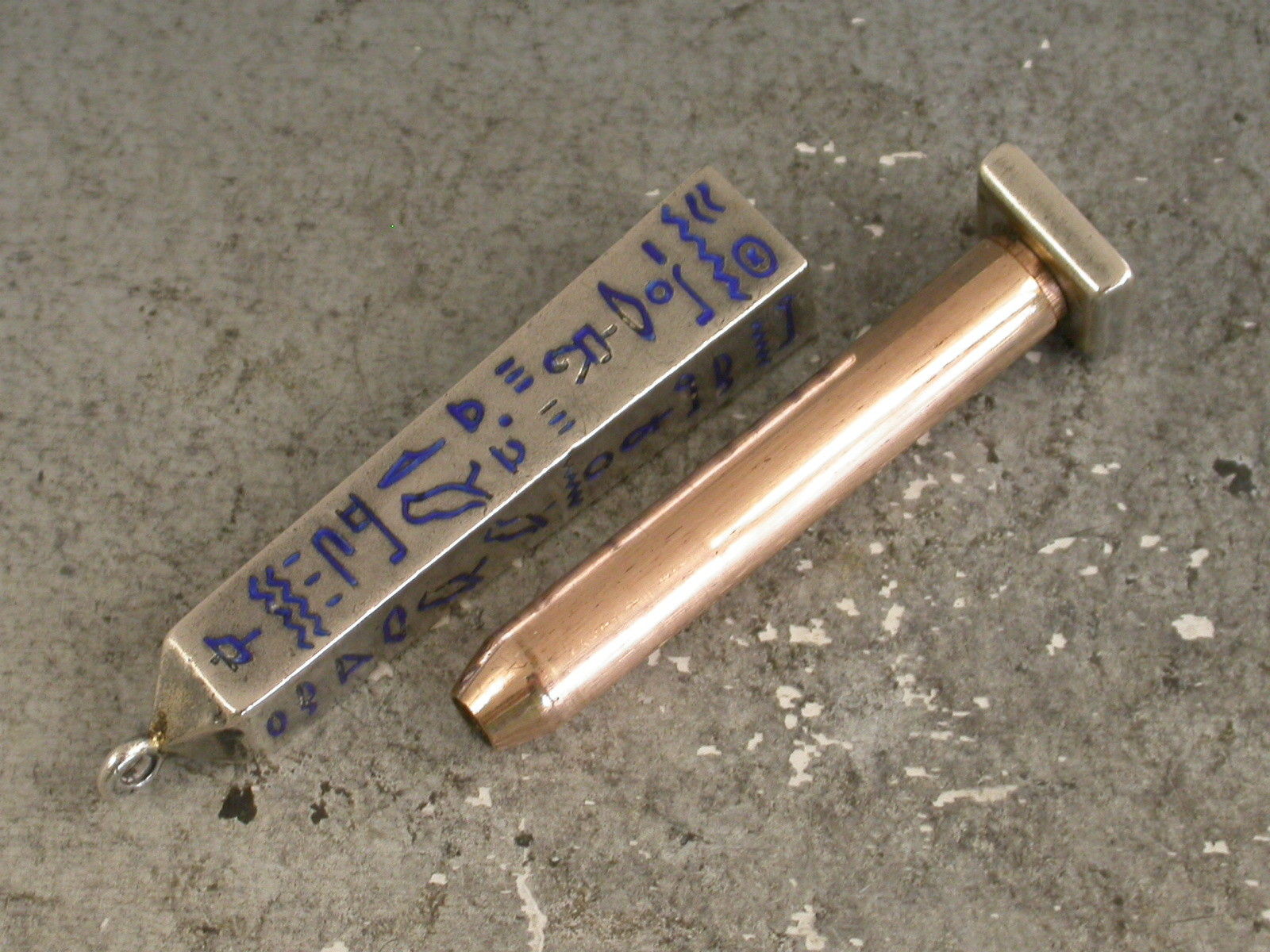 An early 20th century Continental silver and enamel novelty Propelling Pencil made in the form of an Obelisk or 'Cleopatra's Needle'. The body engraved with hieroglyphics highlighted in dark blue enamel, the pull out telescopic gilt metal pencil with square silver base.