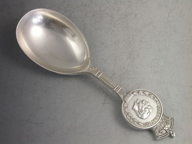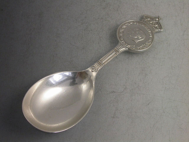 An early 20th century cast silver Caddy Spoon with plain circular bowl and circular medallion to the handle surmounted by a crown, made to commemorate the Coronation of George VI in 1937.