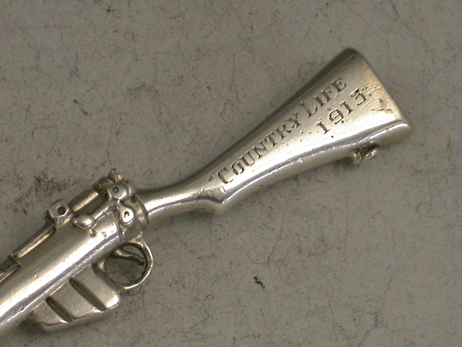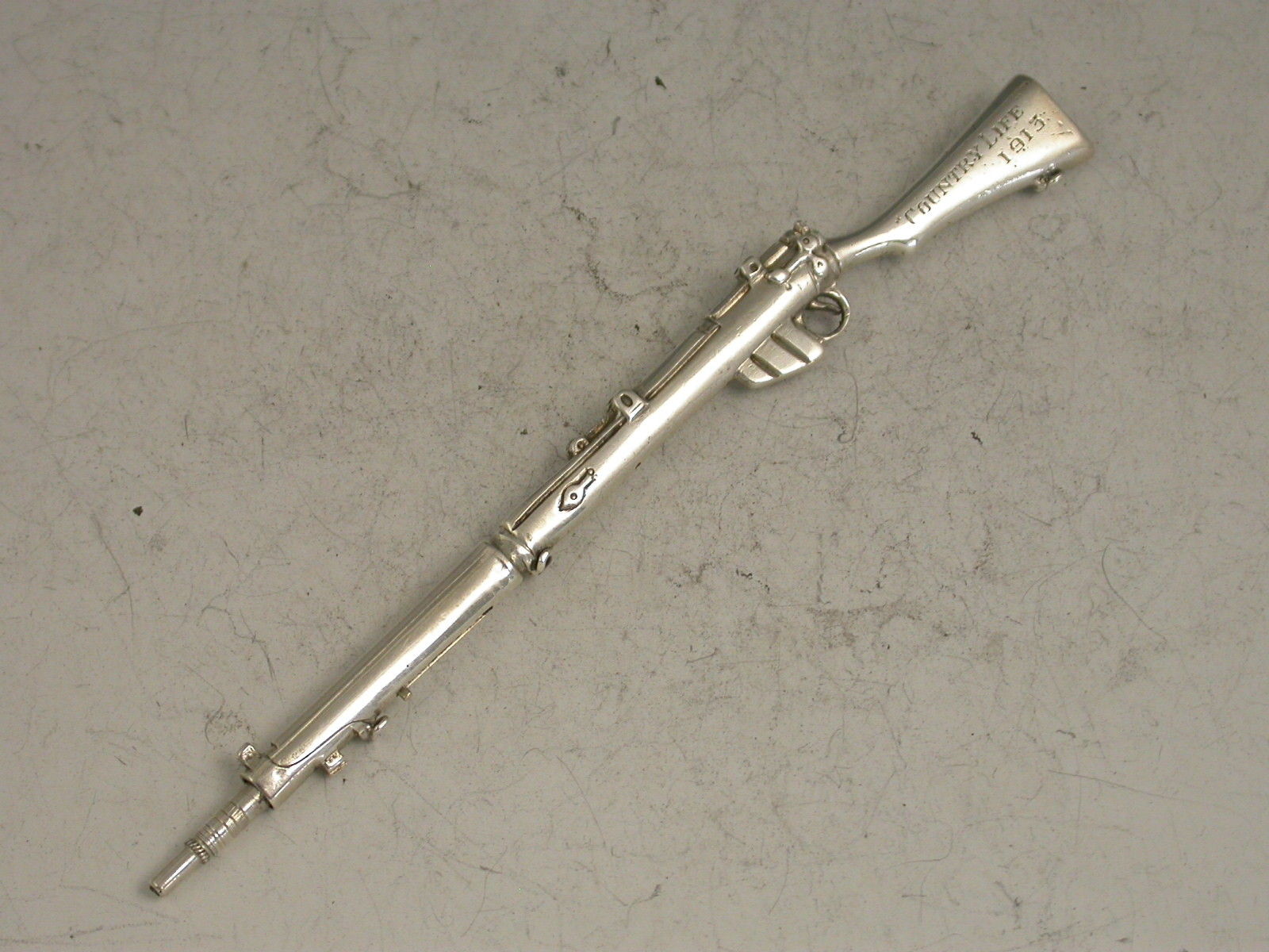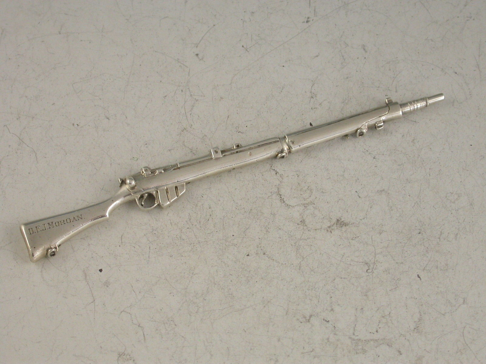 A rare early 20th century novelty silver Presentation Sliding Propelling Pencil modelled as a .303 Lee-Enfield Rifle with the pencil extending from the barrel and the stock engraved ""D.F.J. Morgan"" and ""Country Life 1913"".
