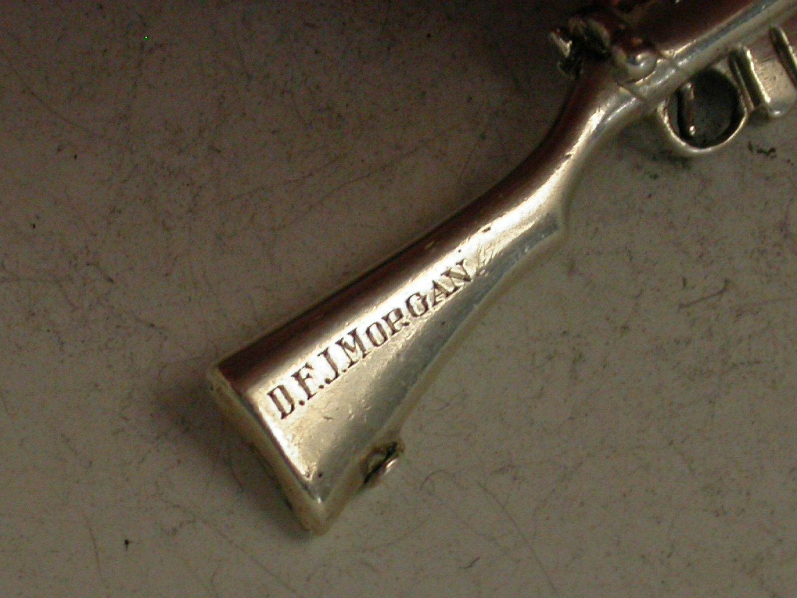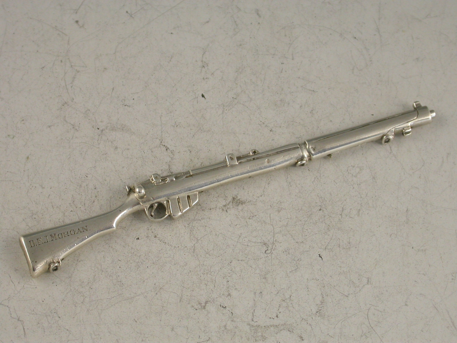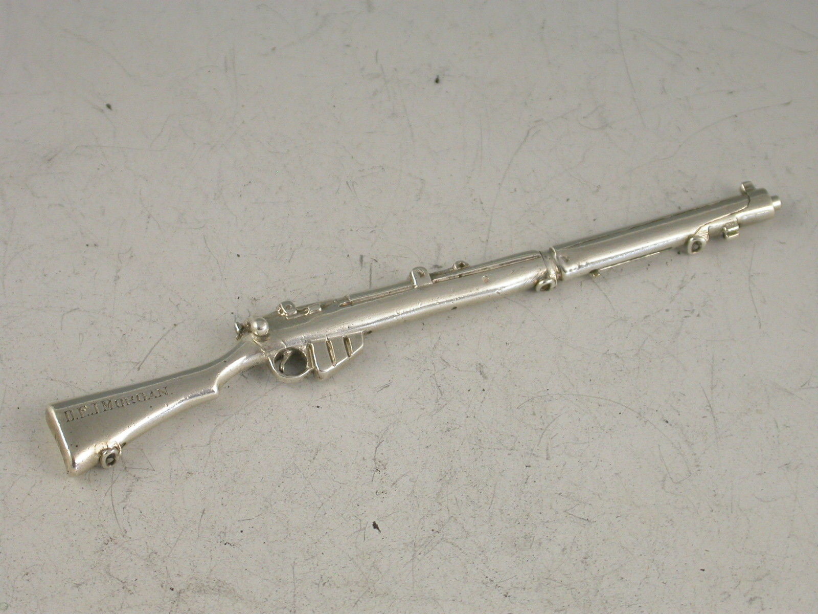 A rare early 20th century novelty silver Presentation Sliding Propelling Pencil modelled as a .303 Lee-Enfield Rifle with the pencil extending from the barrel and the stock engraved ""D.F.J. Morgan"" and ""Country Life 1913"".