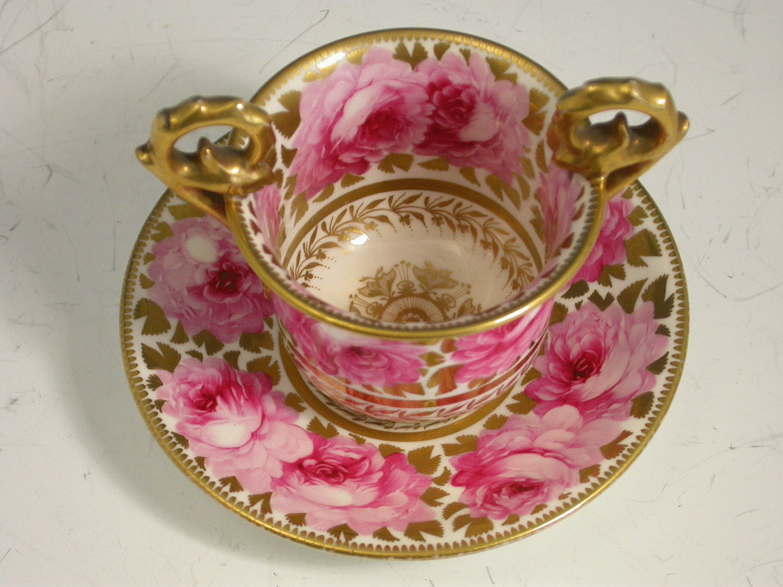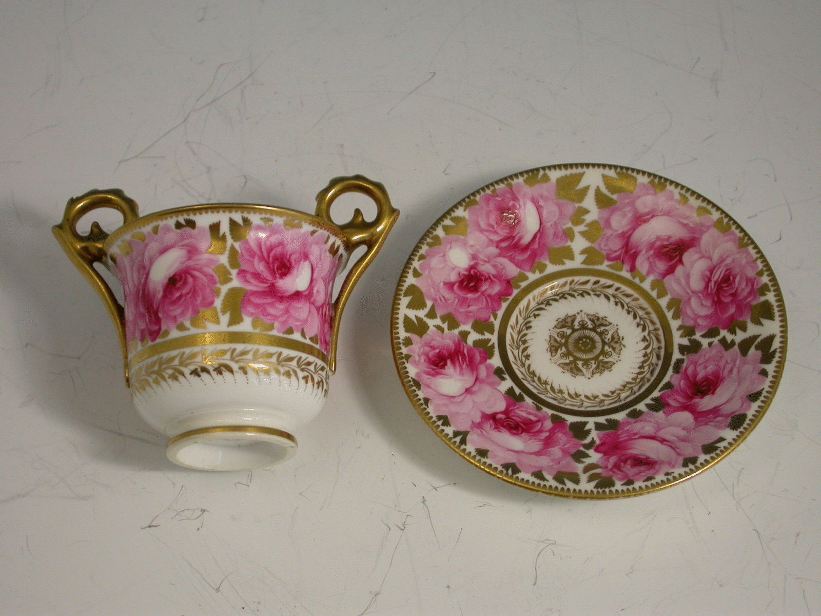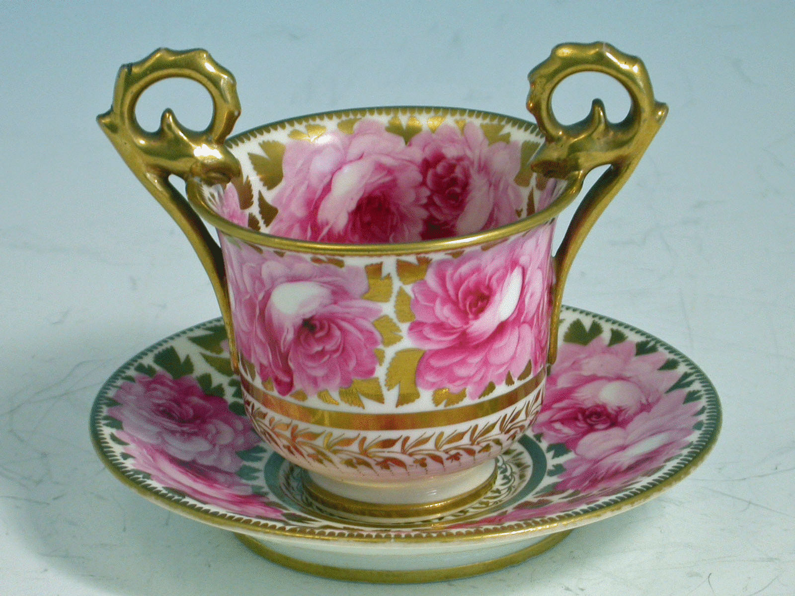 A fine Davenport Cabinet Cup and Saucer of twin-handled form, painted with a continuous band of pink roses within a gilt dentil border.