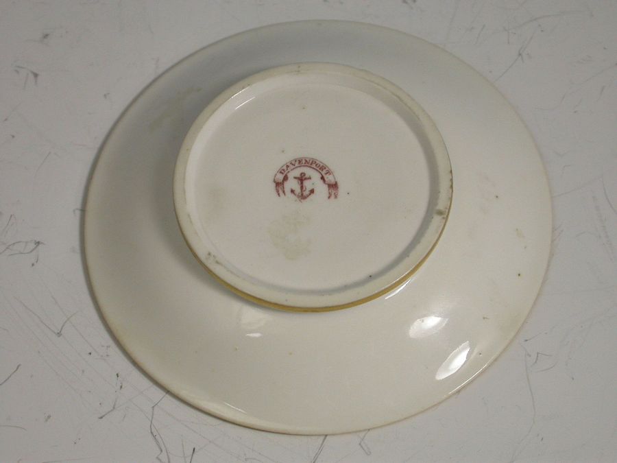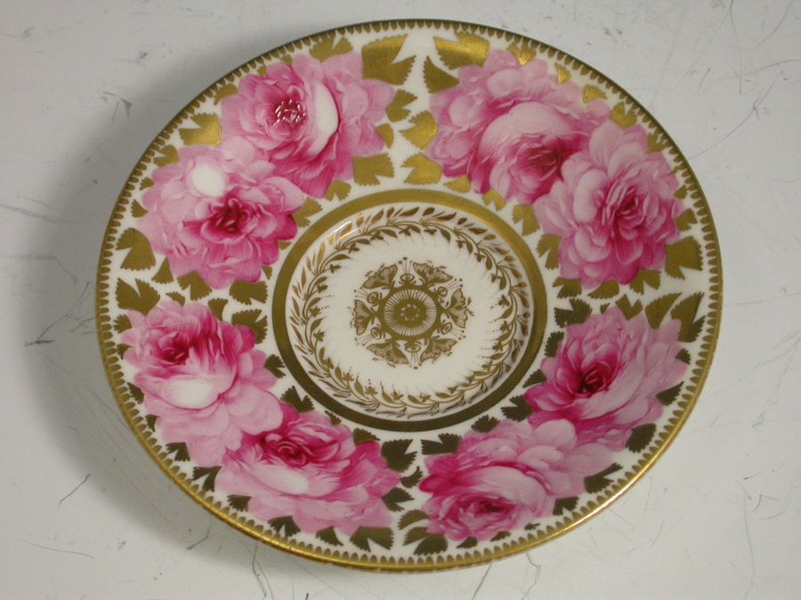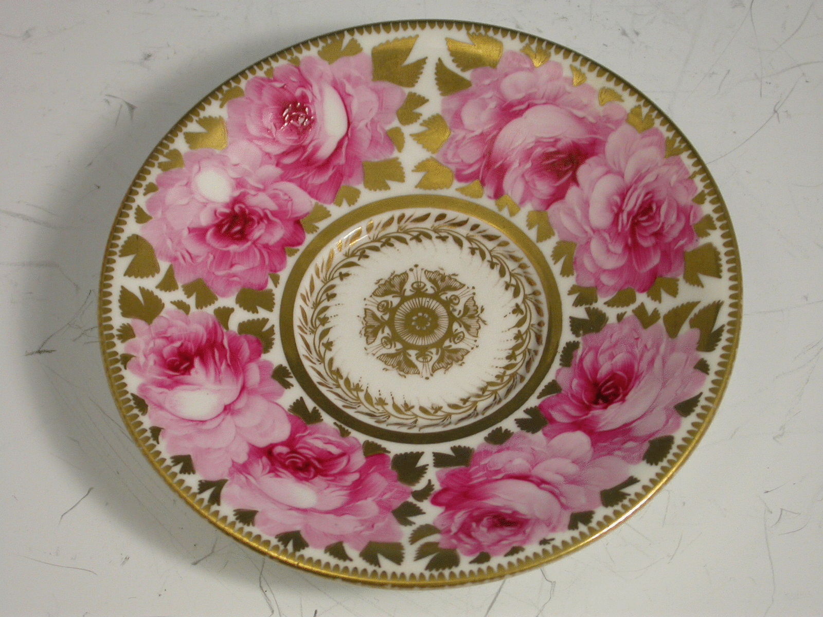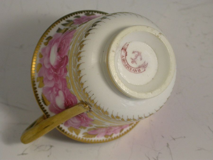 A fine Davenport Cabinet Cup and Saucer of twin-handled form, painted with a continuous band of pink roses within a gilt dentil border.