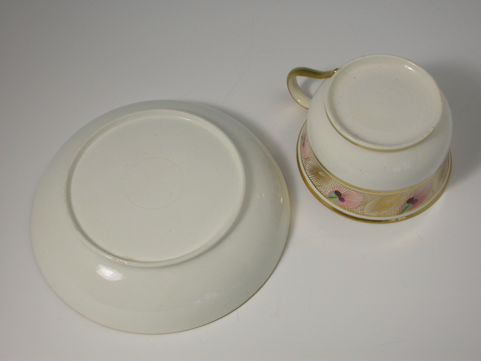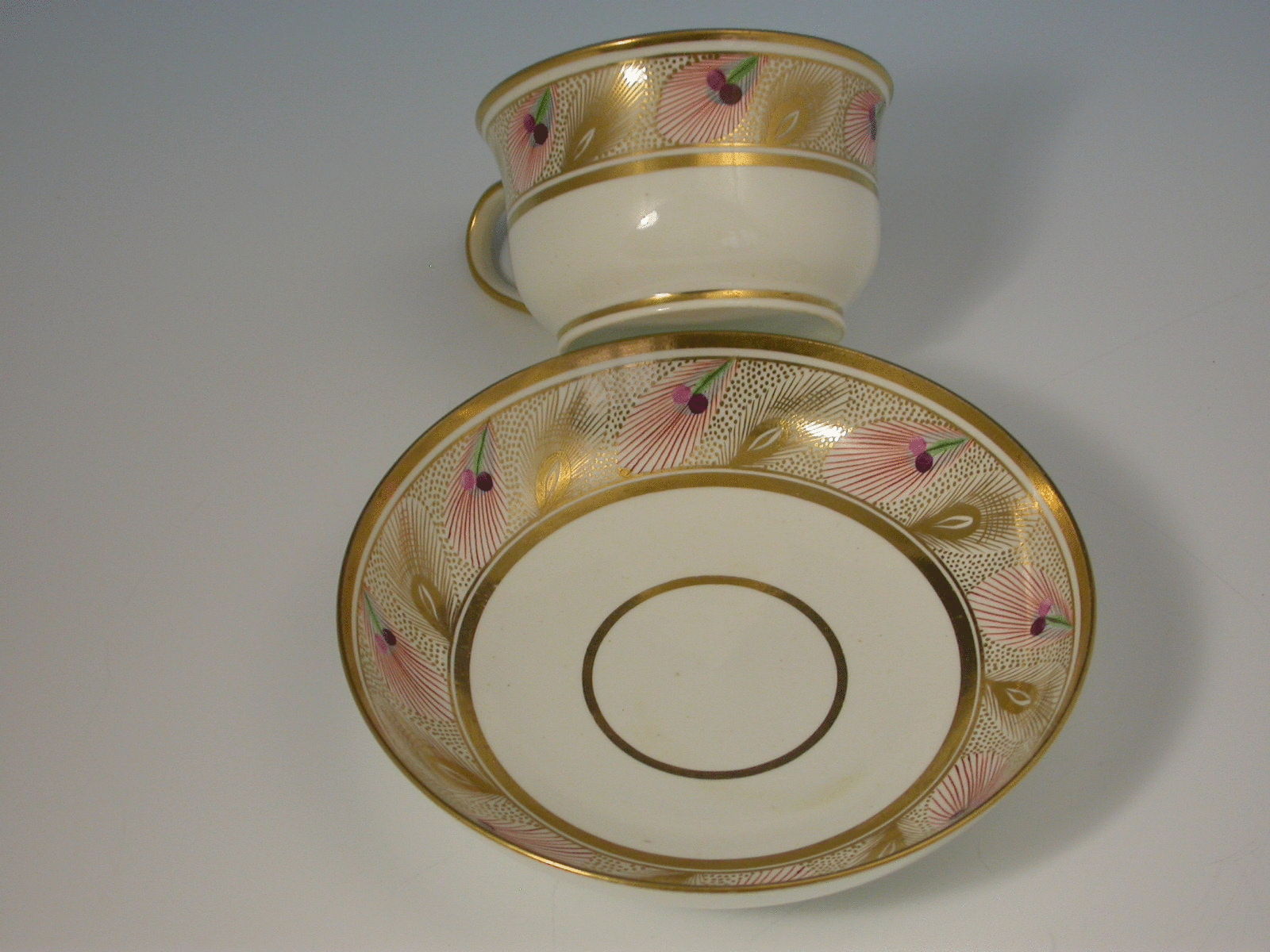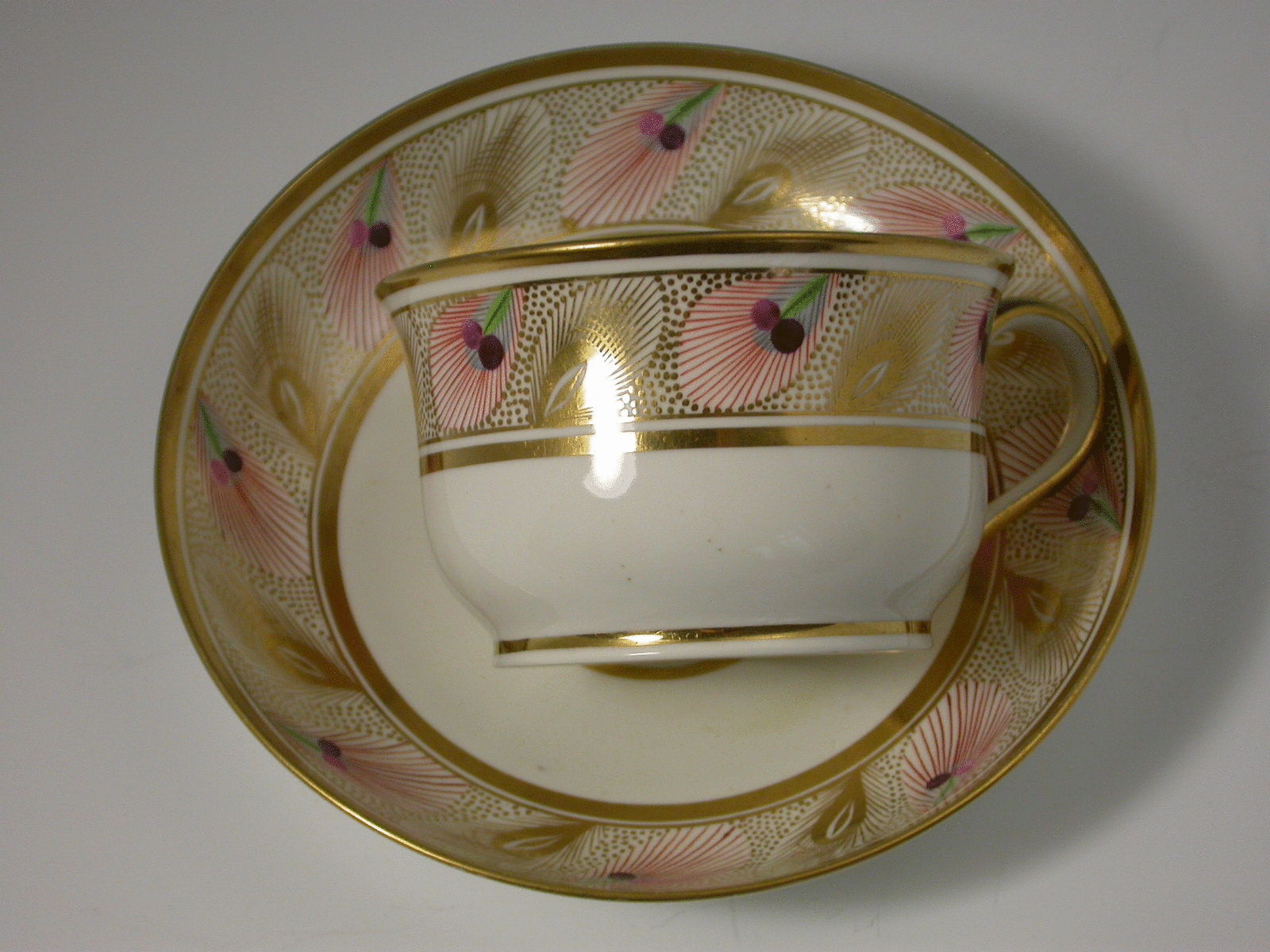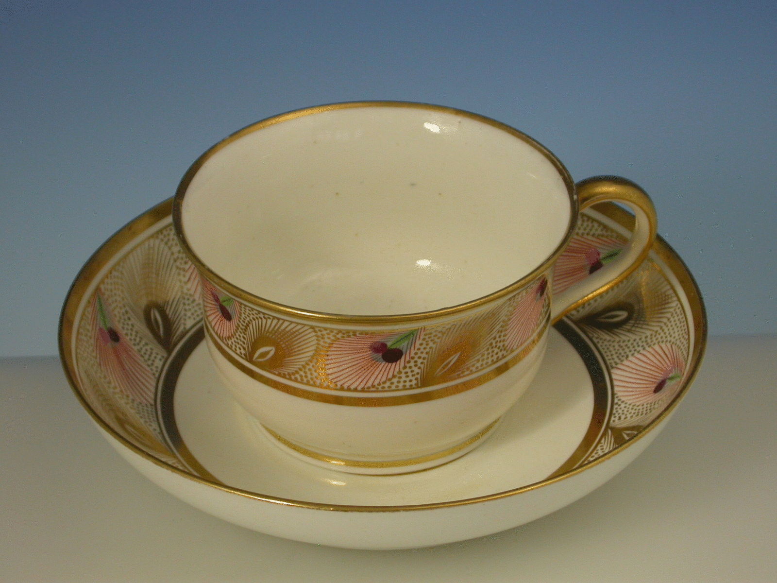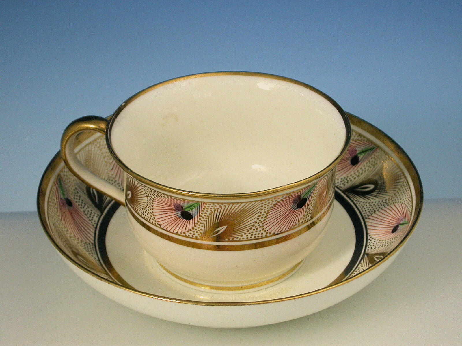 An unusual early 19th century English Porcelain Teacup & Saucer possibly by Davenport, with flared rims, painted with gilded and enamelled feathers.