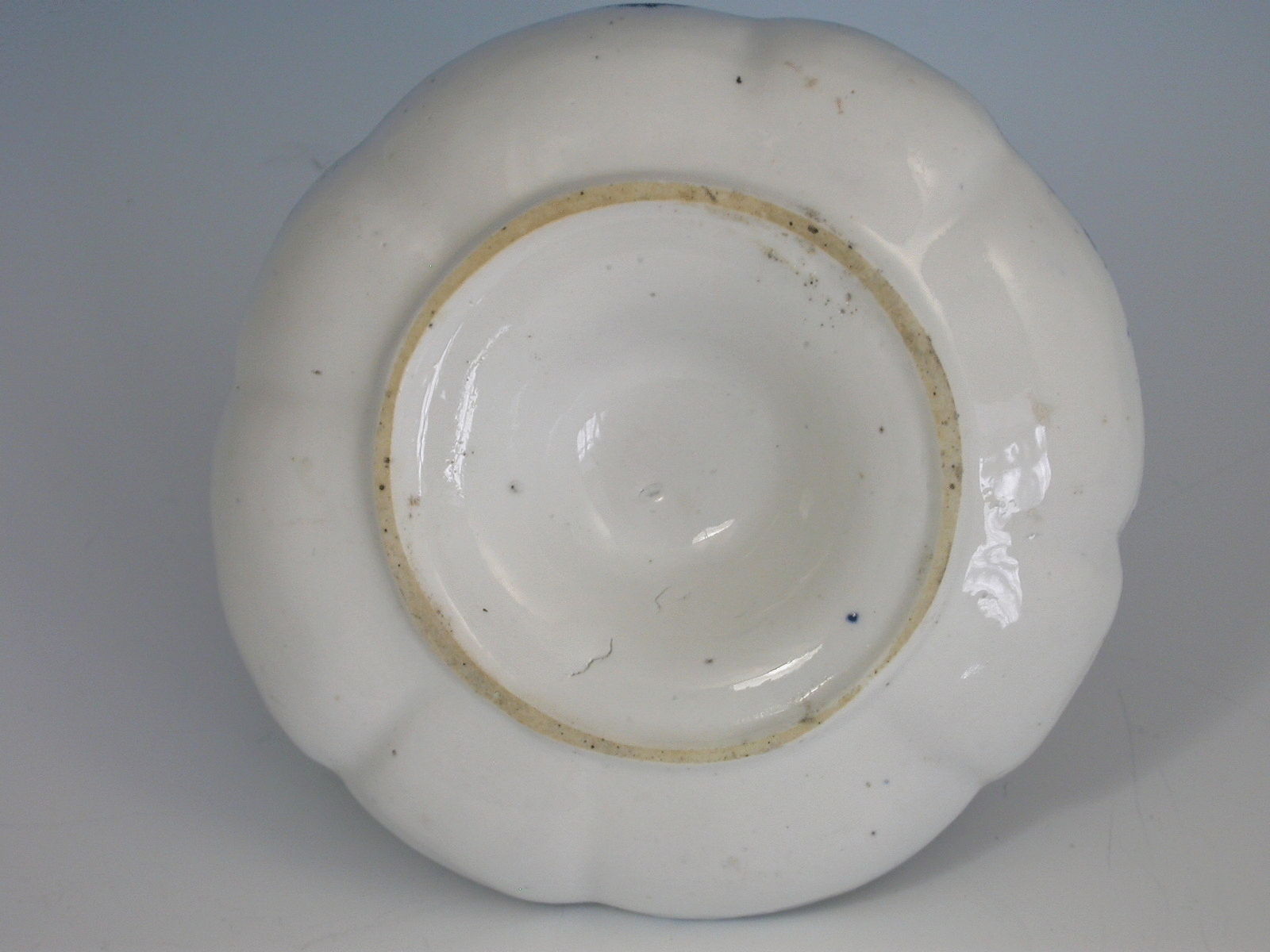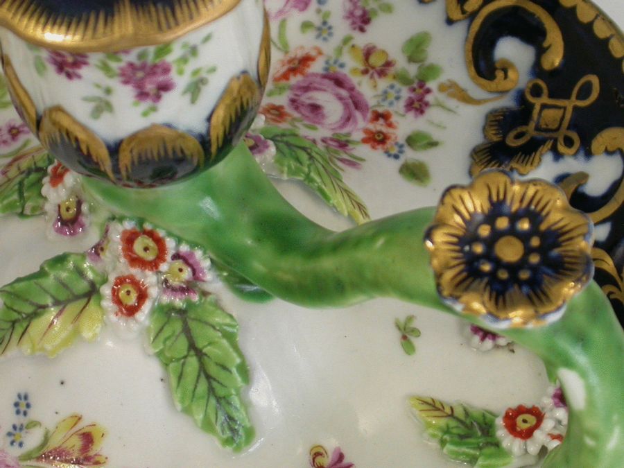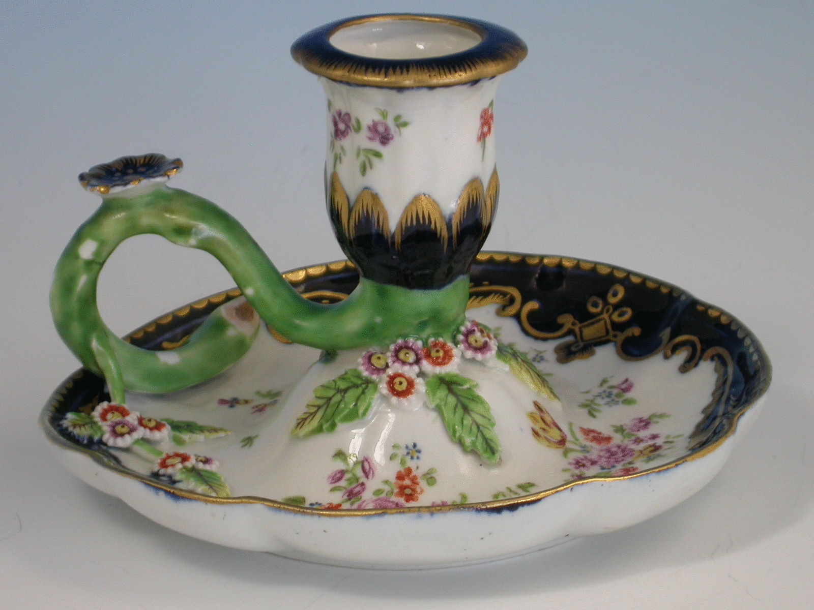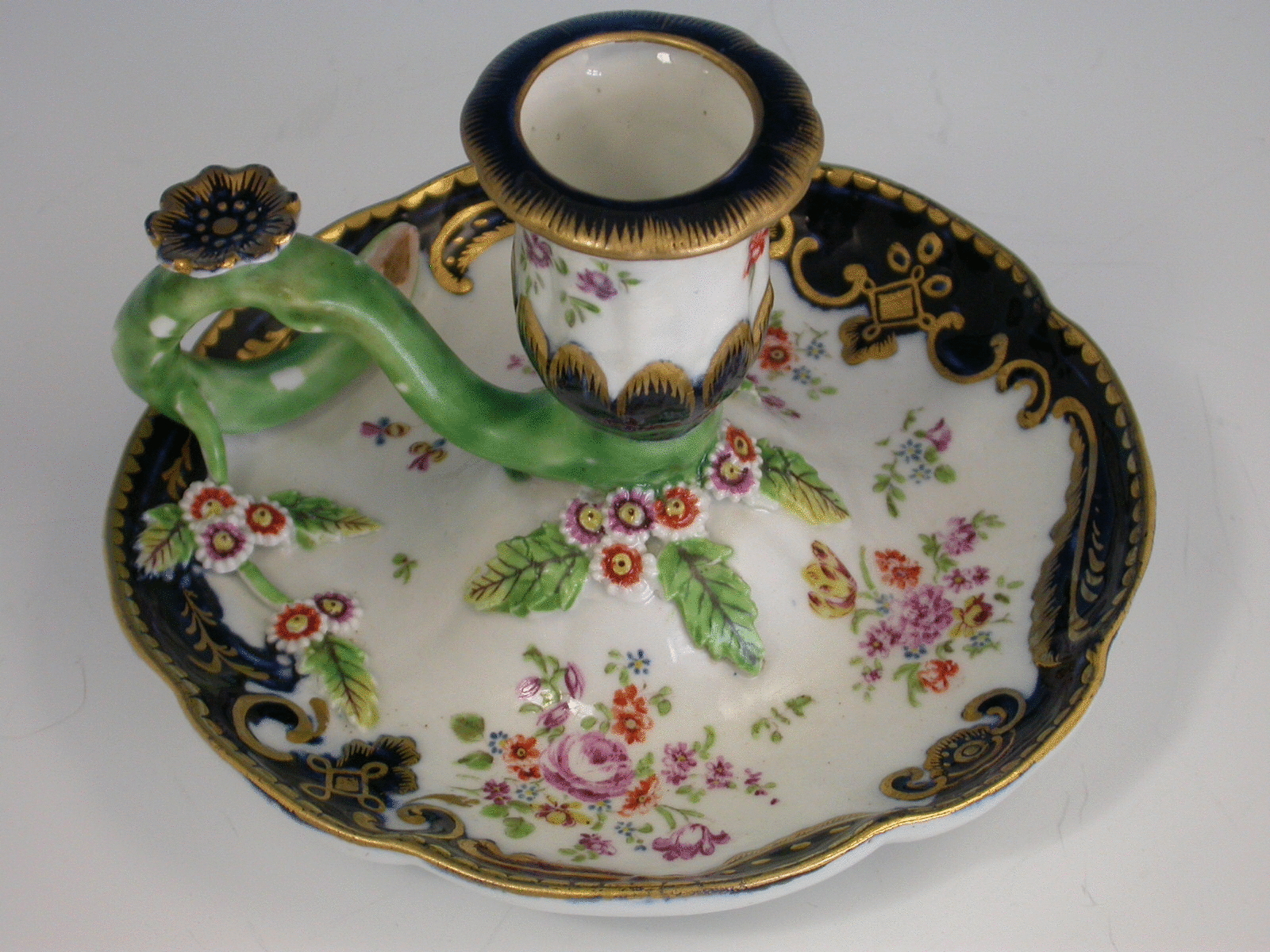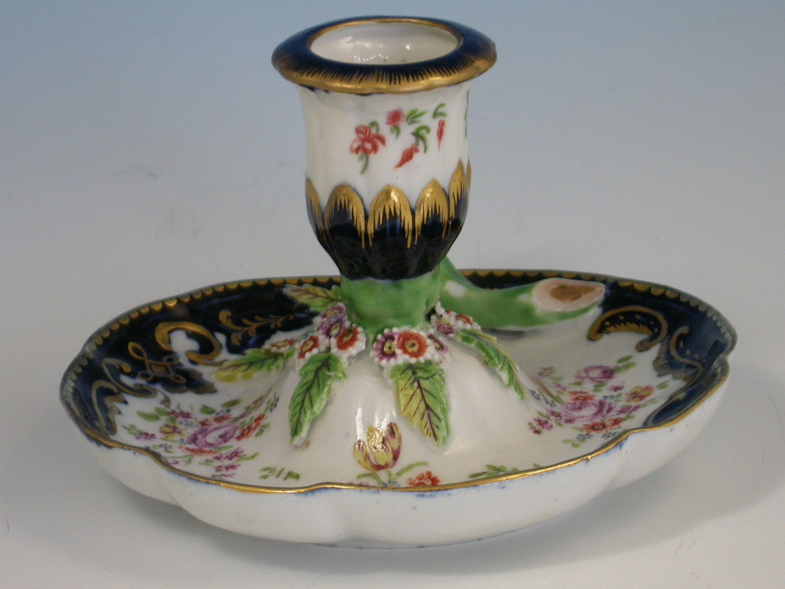A very fine Derby Chamberstick, the tulip shape sconce moulded with leaves and the handle with flower head thumb piece, painted with colourful floral sprays on a blue ground.