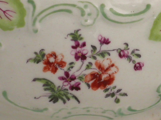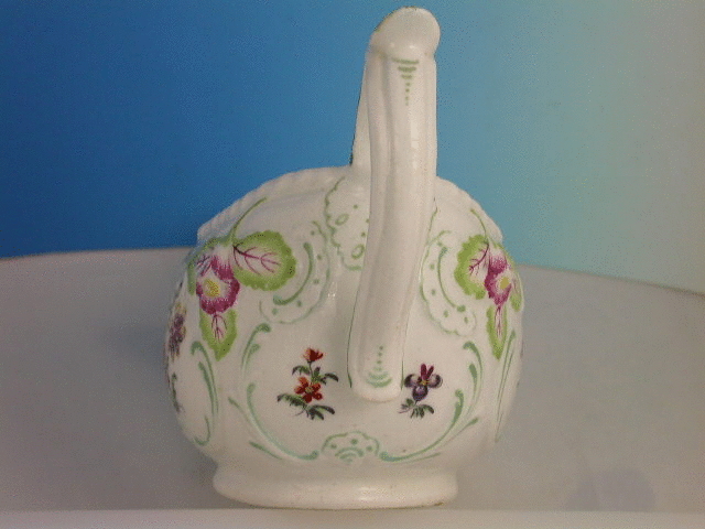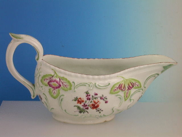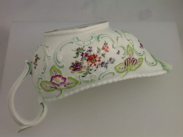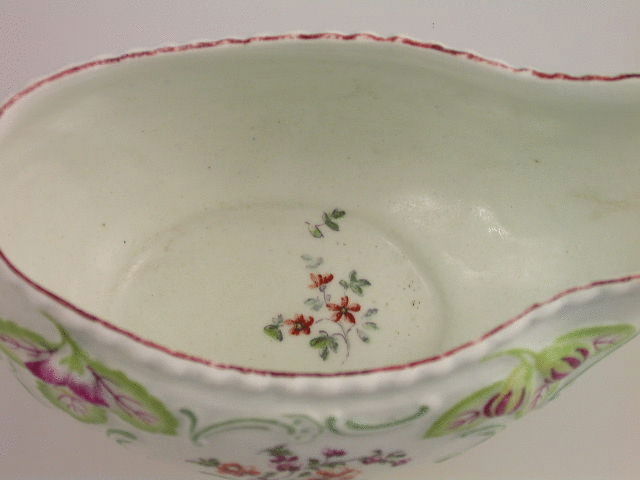 Early Derby moulded Sauce Boat with scrolled kick handle, the central reserve painted with floral bouquets in the style of the “Cotton Stem Painter”.