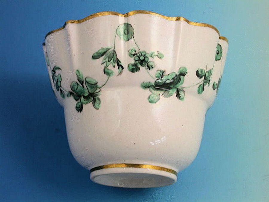 A rare Dr Wall Worcester Cup and Stand of ogee form, painted in the atelier of James Giles in camieau verte with garlands and sprays of English flowers within gilt line border, the interior with a continuous gilt circlet border.