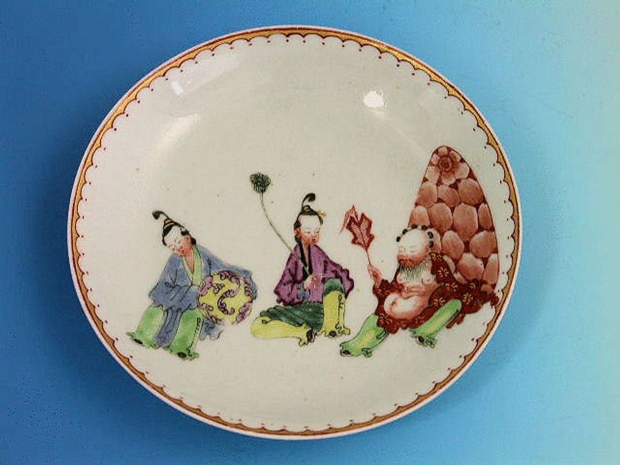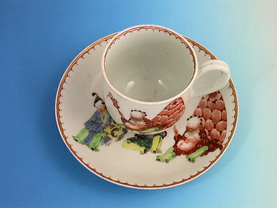 A good Dr Wall Worcester Coffee Cup and Saucer with grooved strap handle, painted in polychrome enamels with the ‘Pu Tai’ pattern.