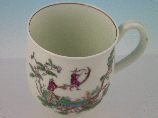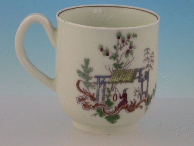 A fine Dr Wall Worcester Coffee Cup of plain “U” shape, with slightly everted rims, grooved strap handle, printed in black and hand coloured with “Les Garcons Chinois” pattern after Pillement, the interior with black line rim. c1760.