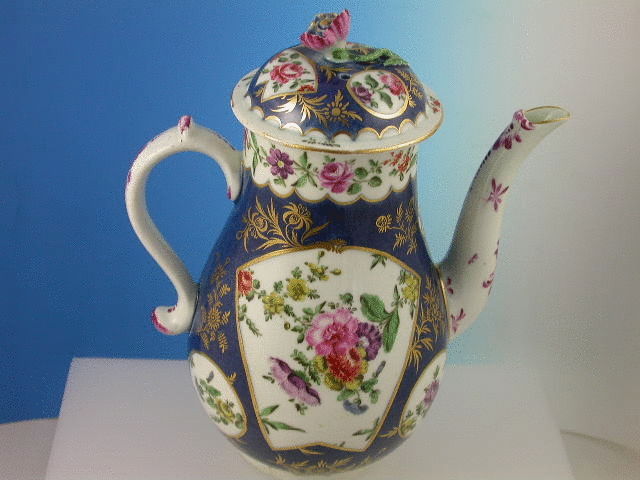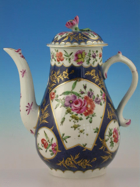 A fine Dr Wall Worcester Coffee Pot and Cover of baluster form with curved spout, scrolled handle with thumb piece, the cover with open floral knop, on a powder blue ground, painted in the gilt enriched fan shaped reserves with bouquets of flowers enclosing circular shaped panels with floral sprays, the border with a continuous panel of trailing flowers, the spout with puce camieau sprays. c1765-68.