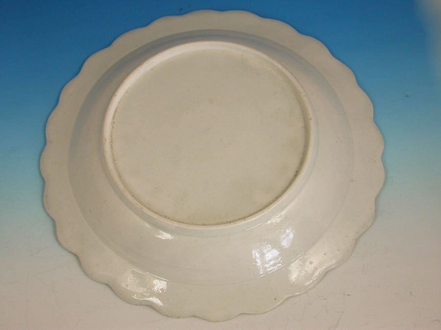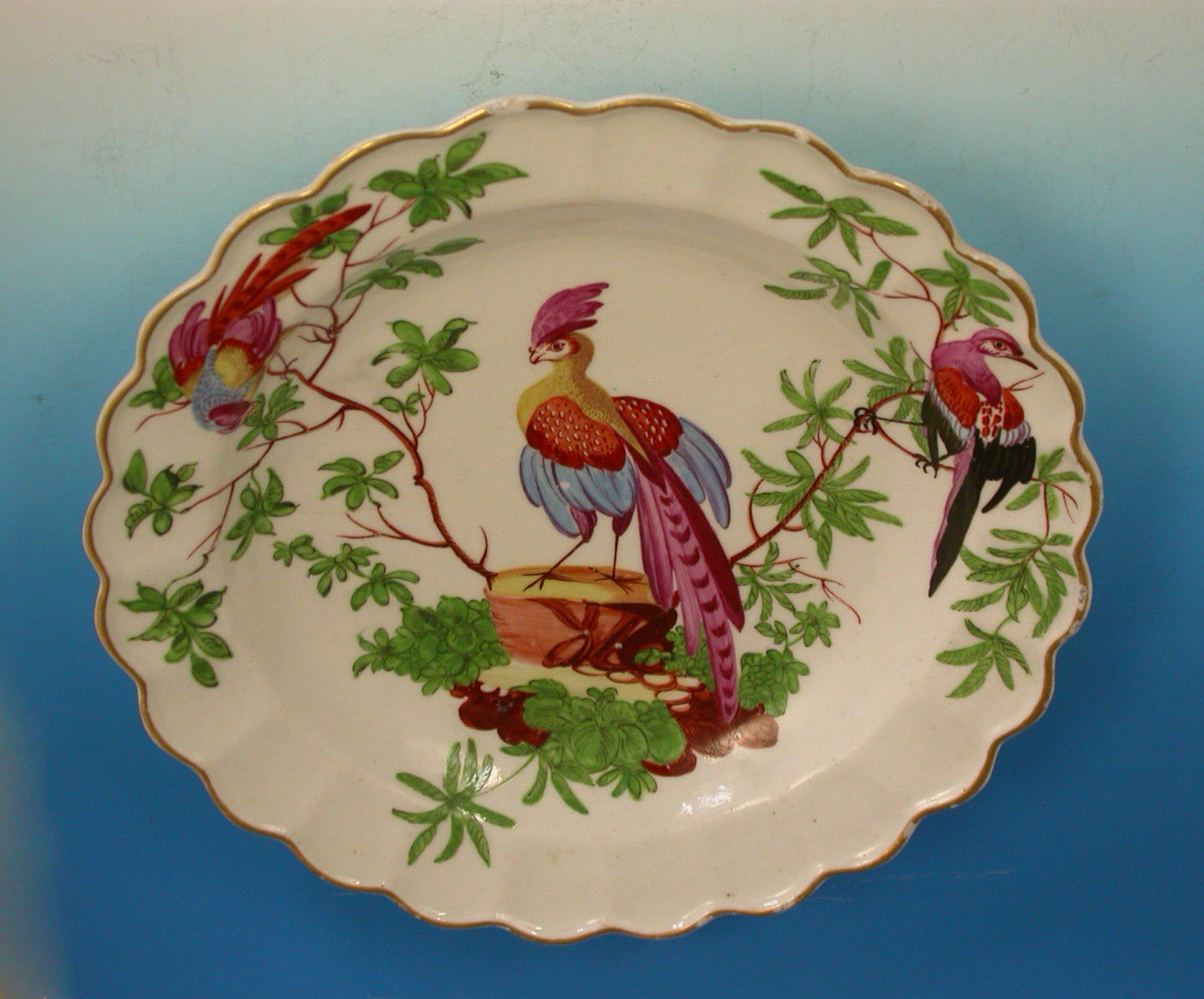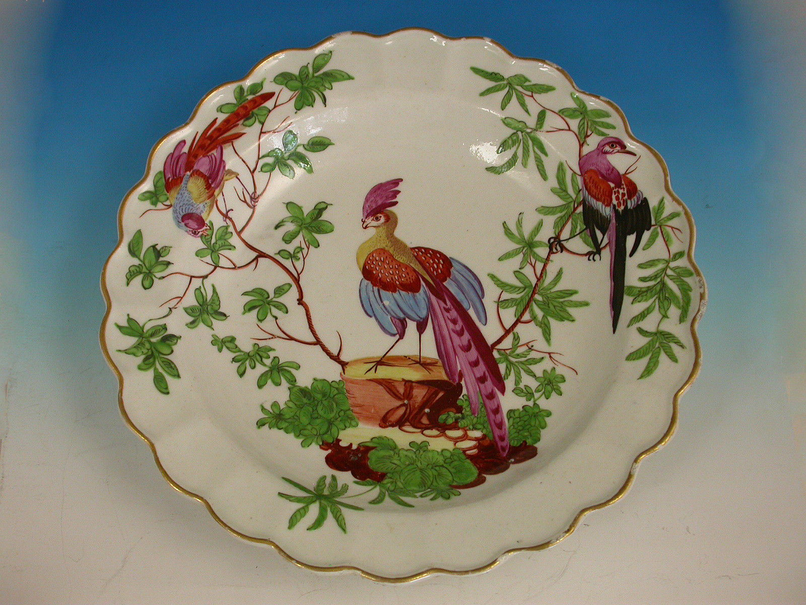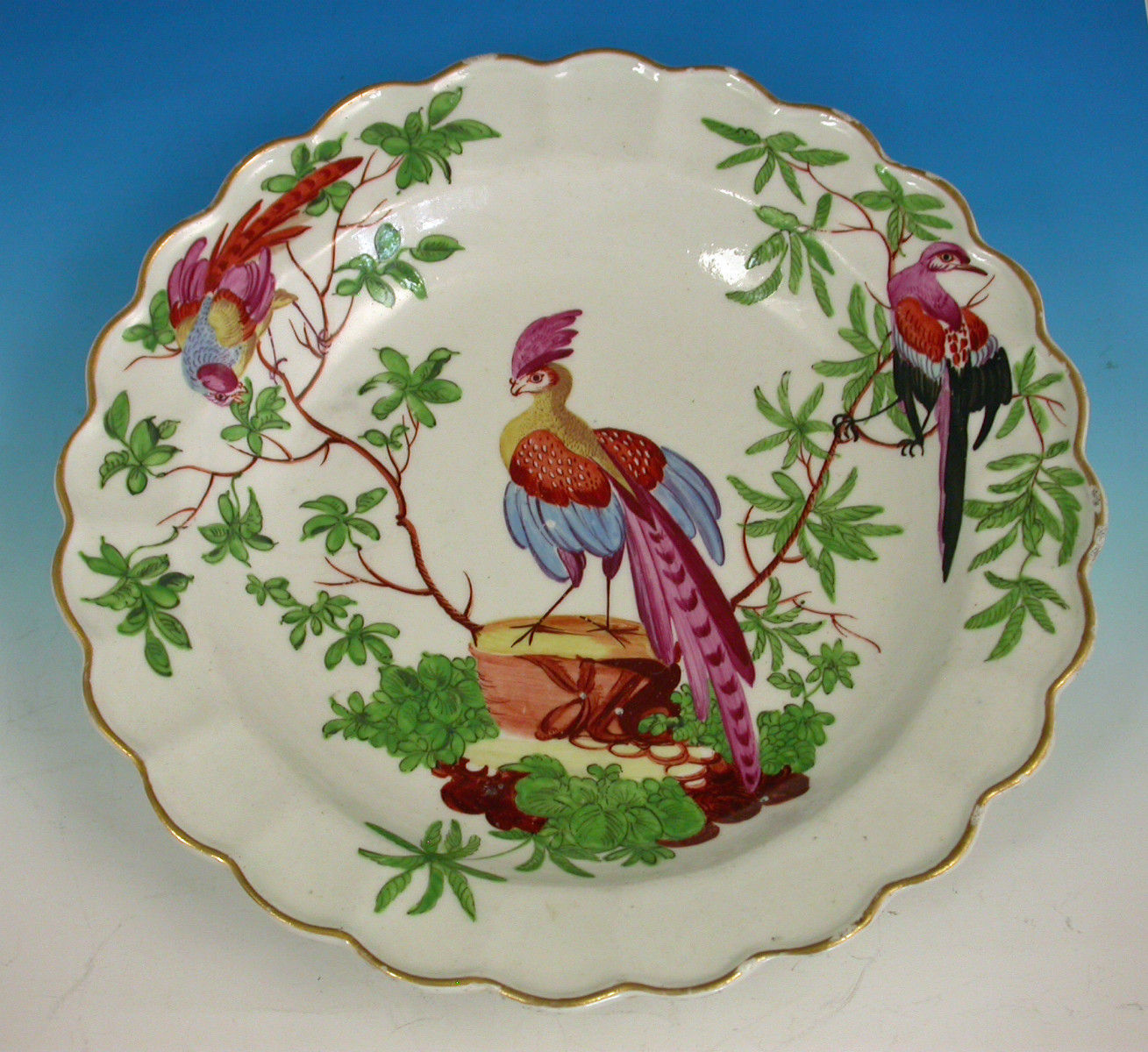 A fine Dr Wall Worcester Dessert Plate with scalloped rims, painted in the Atelier of Jame Giles with a large exotic bird perched on a tree trunk with branches extending from the trunk containing two further exotic birds perched in the branches, all within gilt line rims.