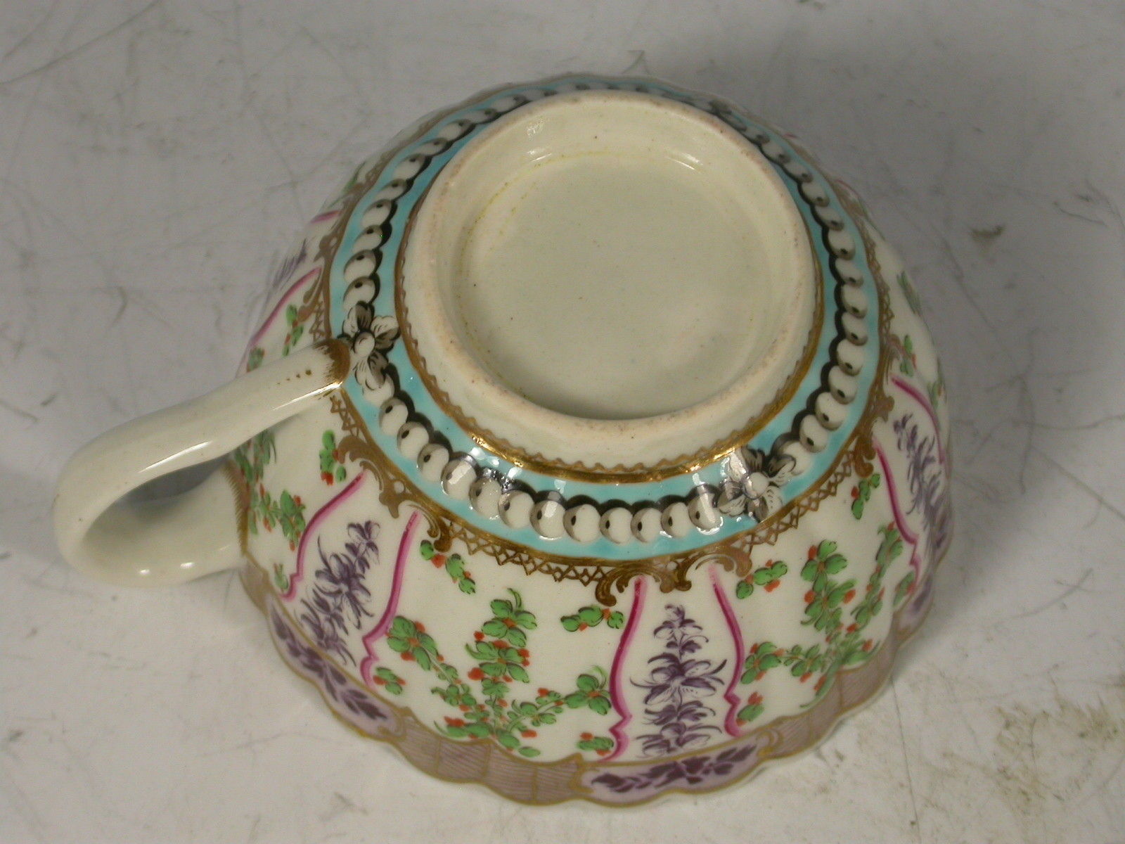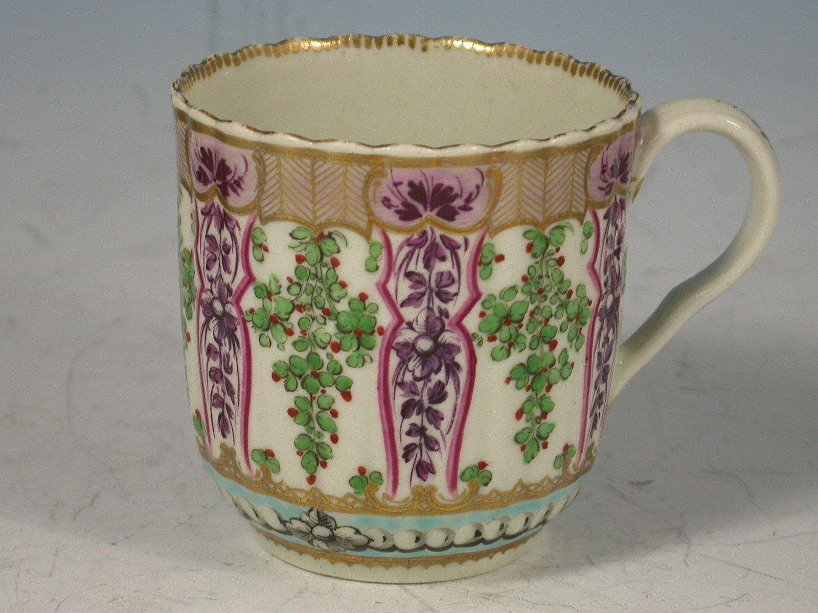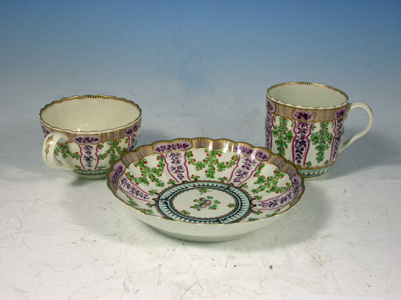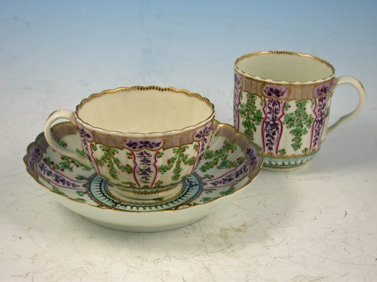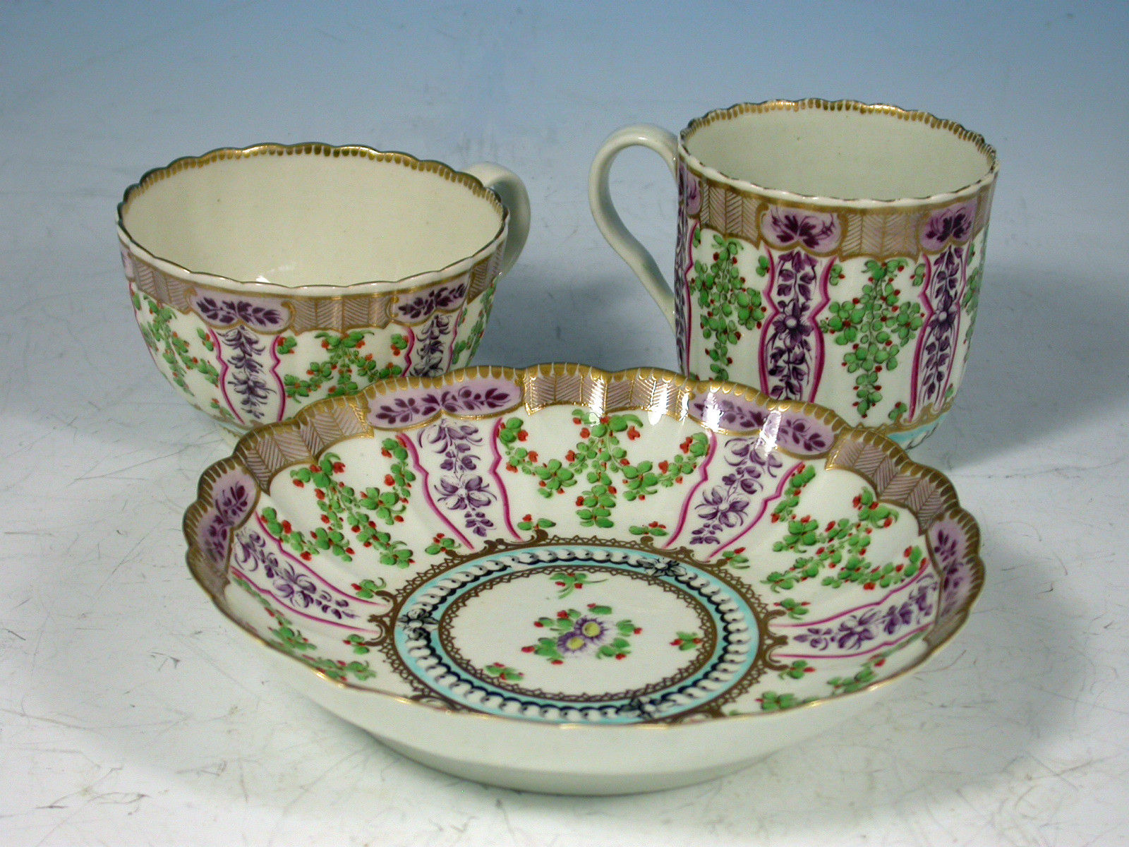 A very fine Dr Wall Worcester Trio of Coffee Cup, Tea Cup and Saucer of fluted form, from the lilac version of the Holly Berry / Hop Trellis Service after the Sevres original, painted with a flower spray in the centre surrounded by a turquoise circlet of faux pearls, all within a border of alternating sprays of Holly Berries and foliate sprays, gilt dentil rims.