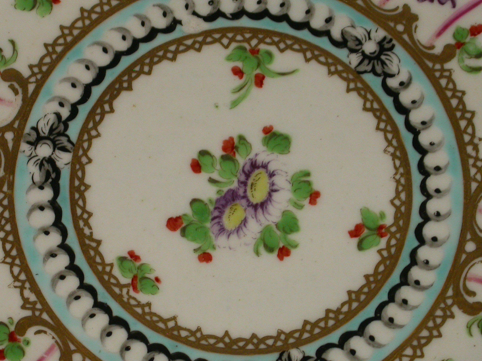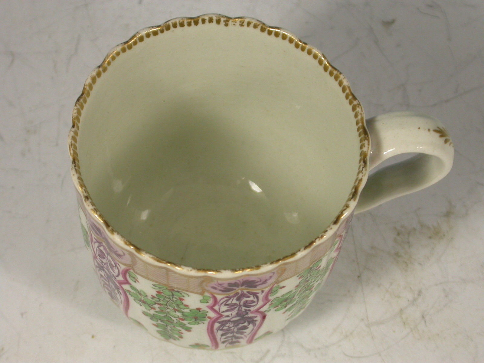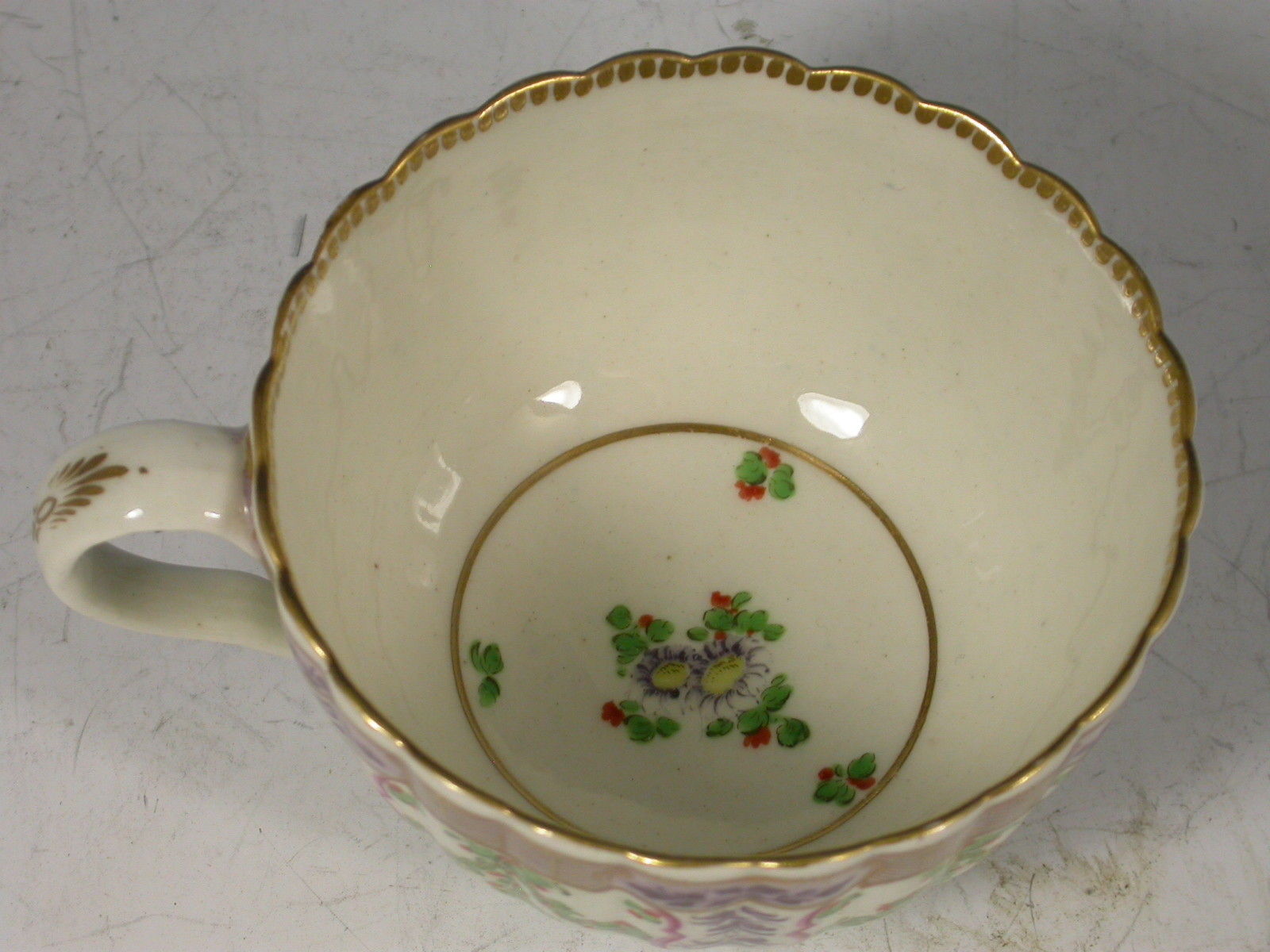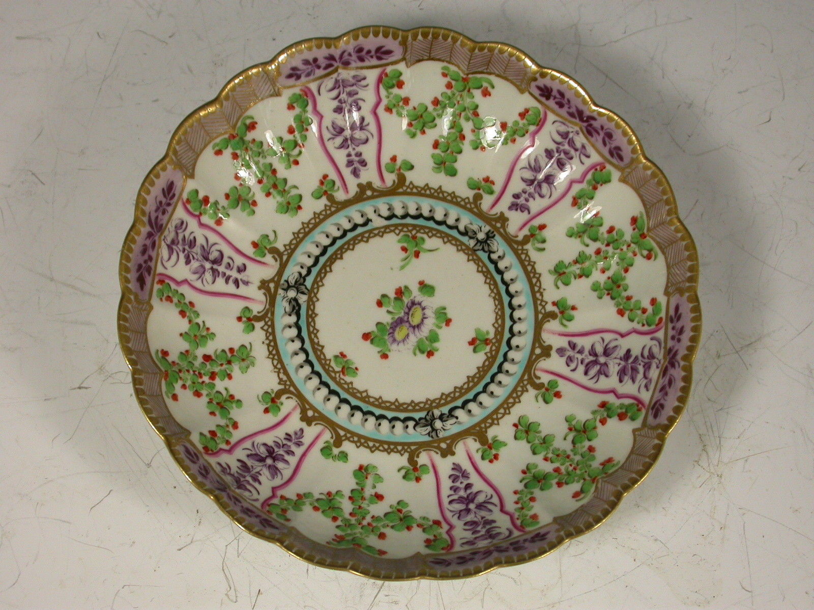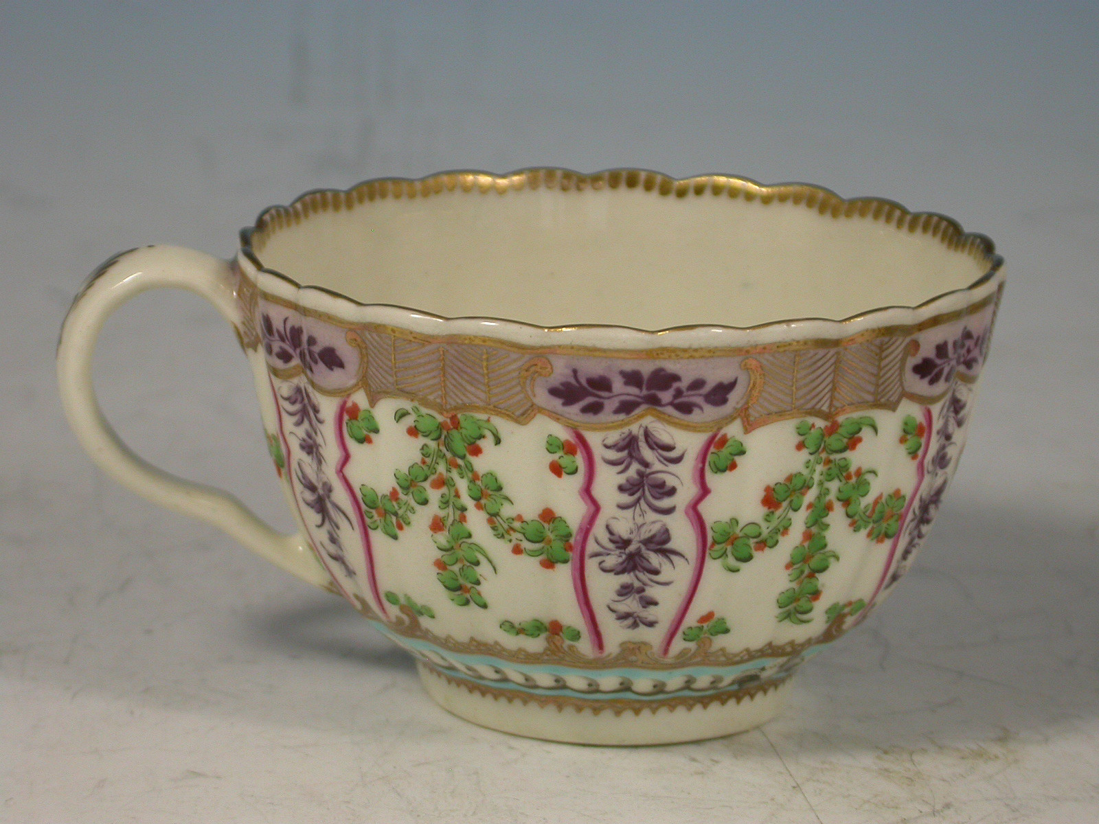 A very fine Dr Wall Worcester Trio of Coffee Cup, Tea Cup and Saucer of fluted form, from the lilac version of the Holly Berry / Hop Trellis Service after the Sevres original, painted with a flower spray in the centre surrounded by a turquoise circlet of faux pearls, all within a border of alternating sprays of Holly Berries and foliate sprays, gilt dentil rims.