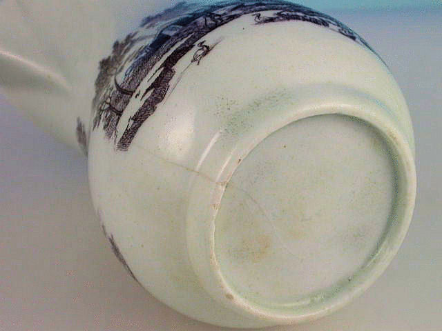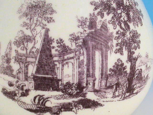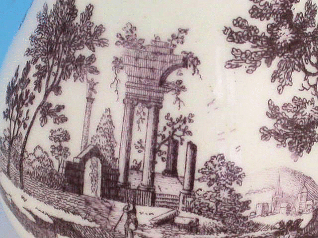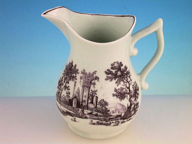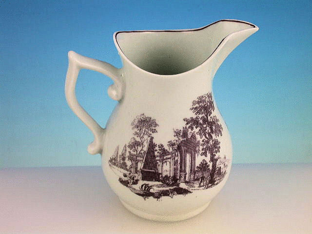 A good Dr Wall Worcester helmet shape Cream Jug with ear shaped handle, printed in lilac with classical ruins.