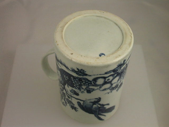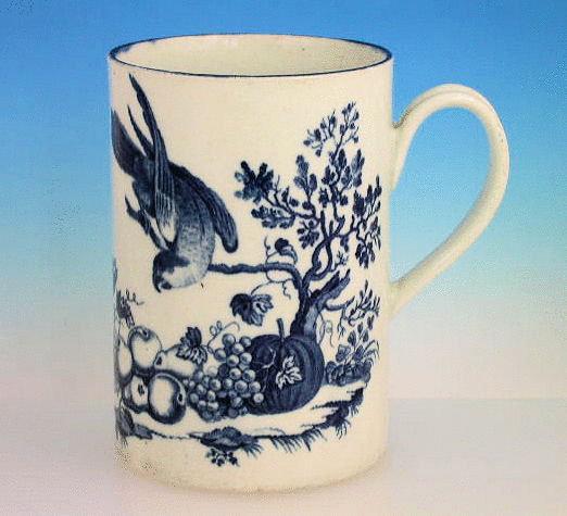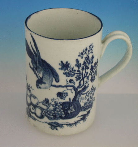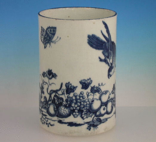 A fine large Dr Wall Worcester large cylindrical Mug with grooved strap handle, printed in underglaze blue with the “the parrot pecking fruit pattern” within blue lined rims.