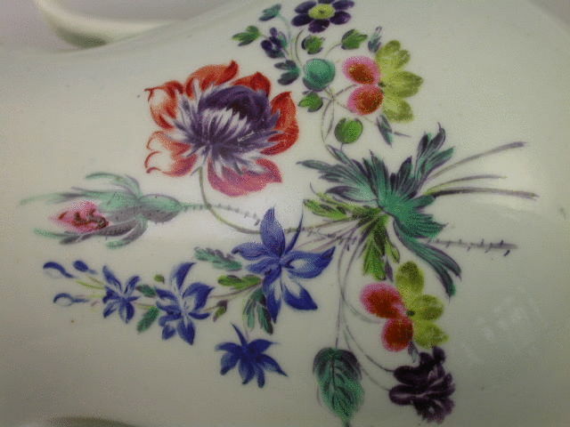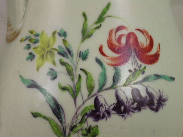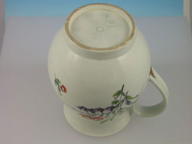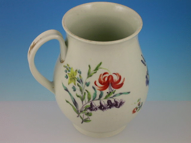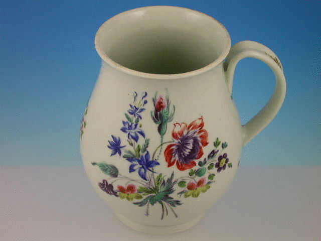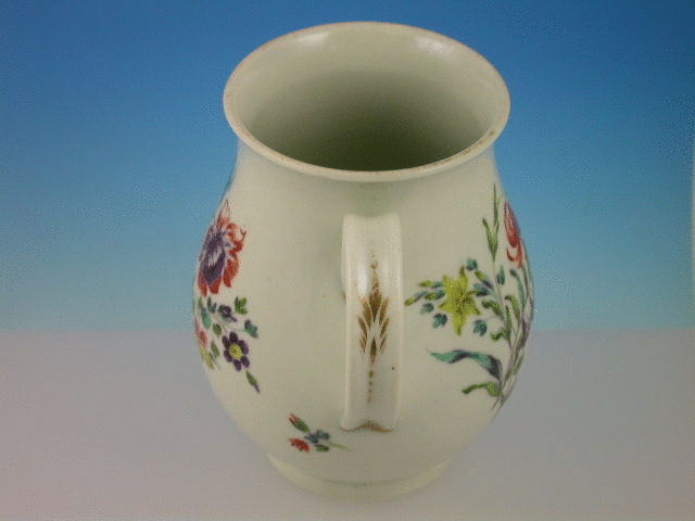 An unusual Dr Wall Worcester baluster shaped Mug with grooved strap handle embellished with gilt, decorated in polychrome enamels with bouquets of English flowers and scattered sprigs including a spray of dry blue cornflowers.