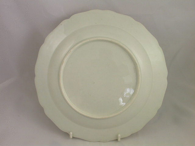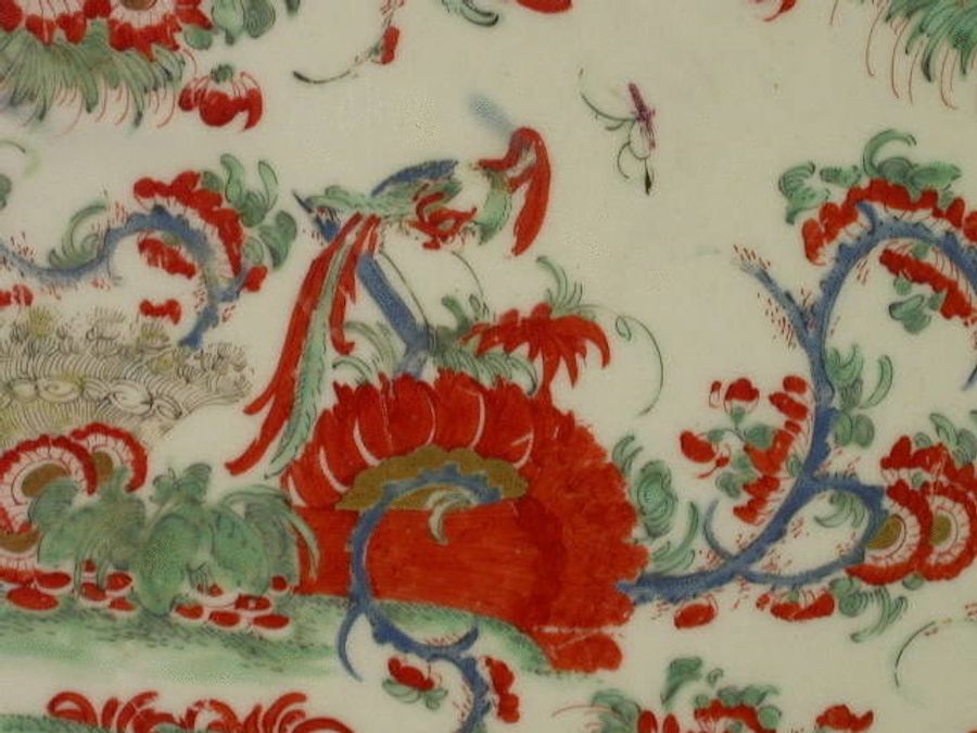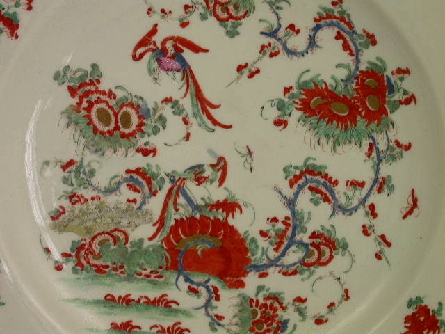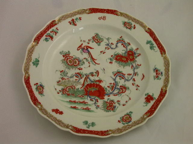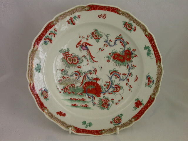 A fine Dr Wall Worcester Phoenix pattern Plate with lobed border, depicting two phoenix type birds amongst prunus and chrysanthemum sprays with a wheatsheaf motif in the foreground, all within a garlanded border, alternate gilt and rouge de fer panels. c1765.