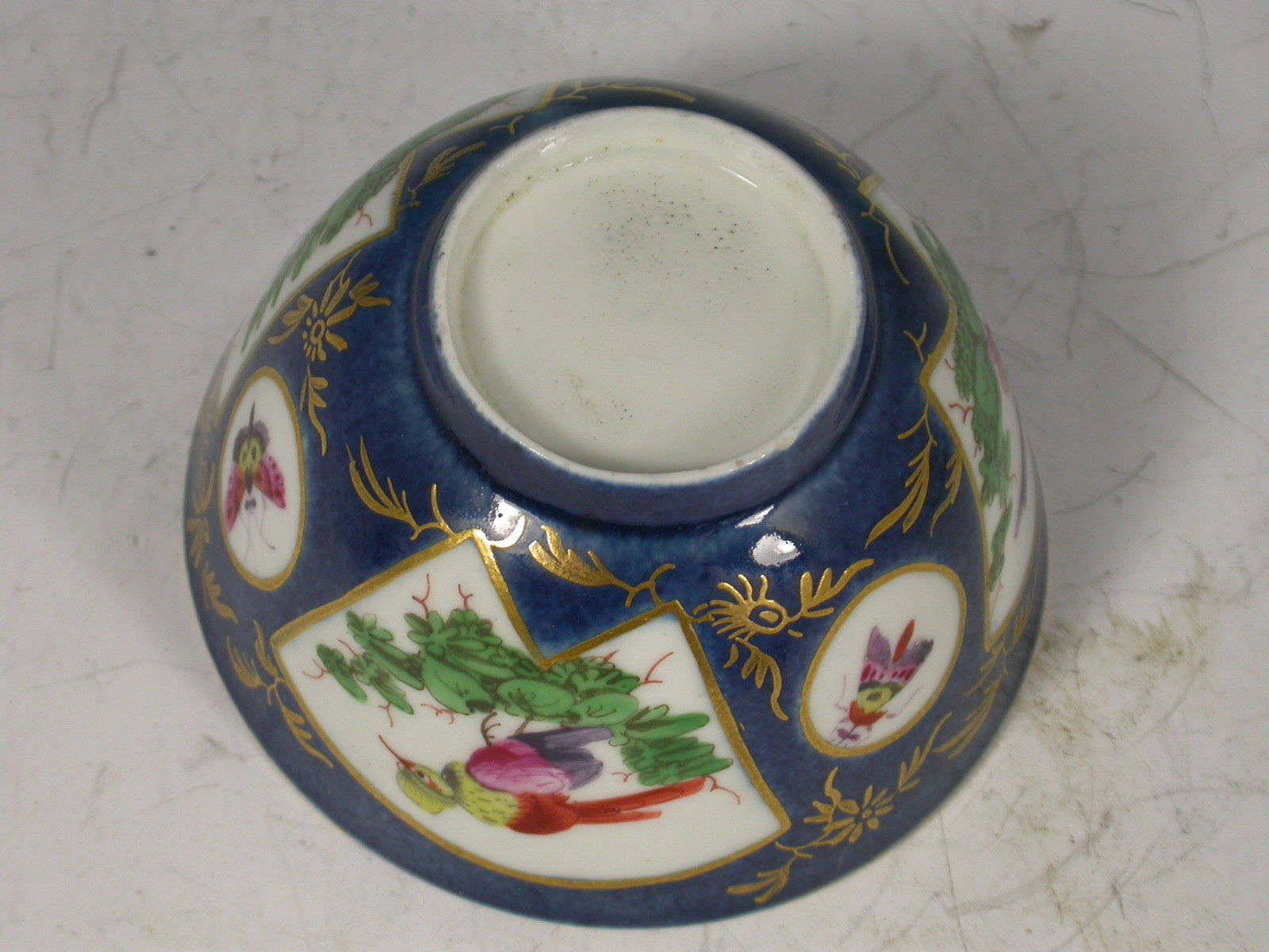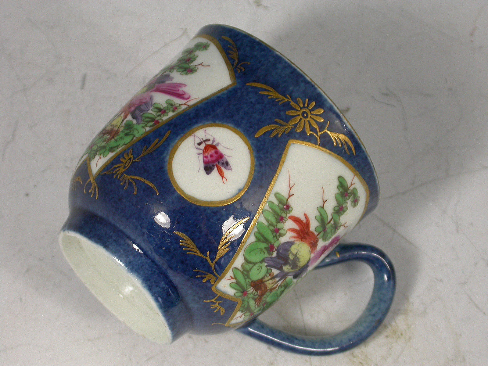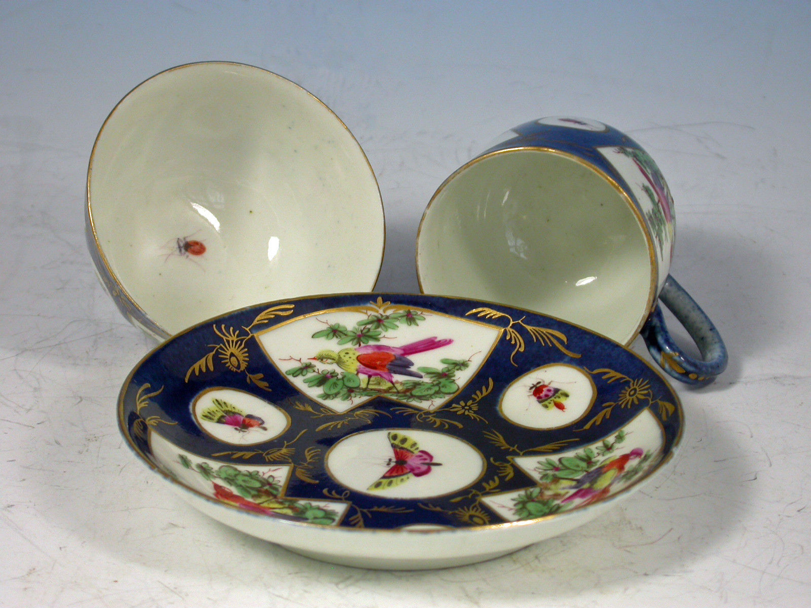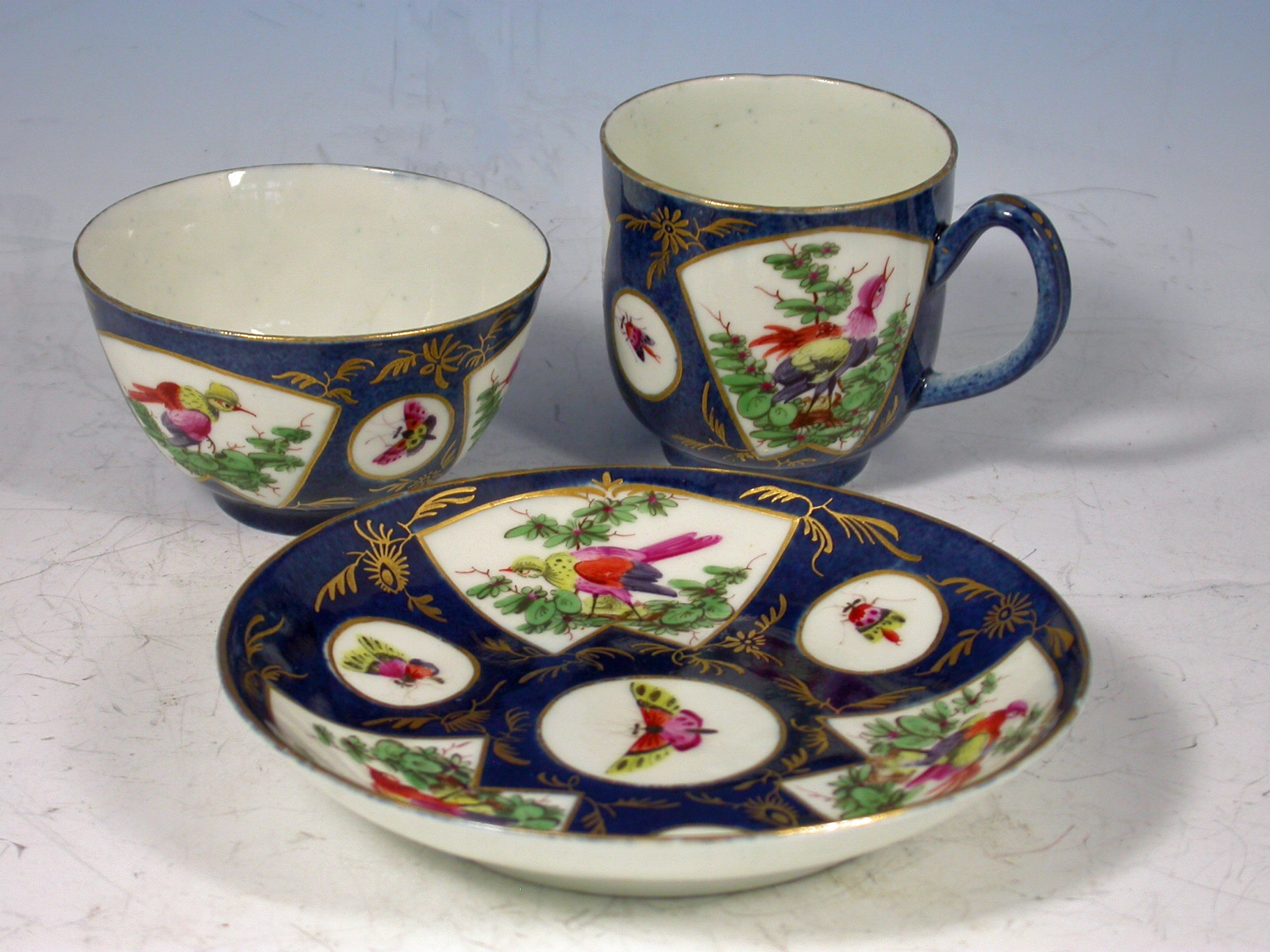 A fine Dr Wall Worcester Trio of Coffee Cup, Tea Bowl and Saucer, on gilt enriched powder blue ground, painted in the fan shaped panels with exotic birds in a landscape setting, alternating with circular reserves of insects, gilt line border.