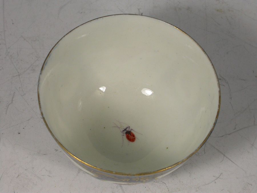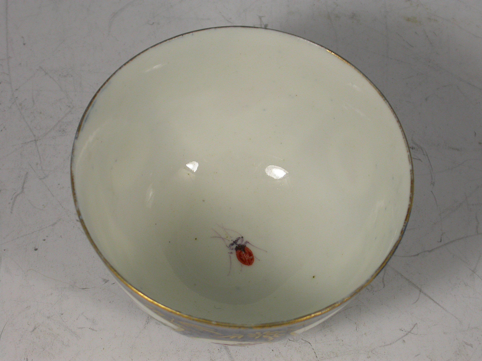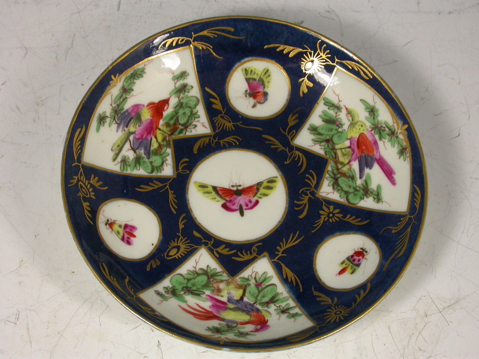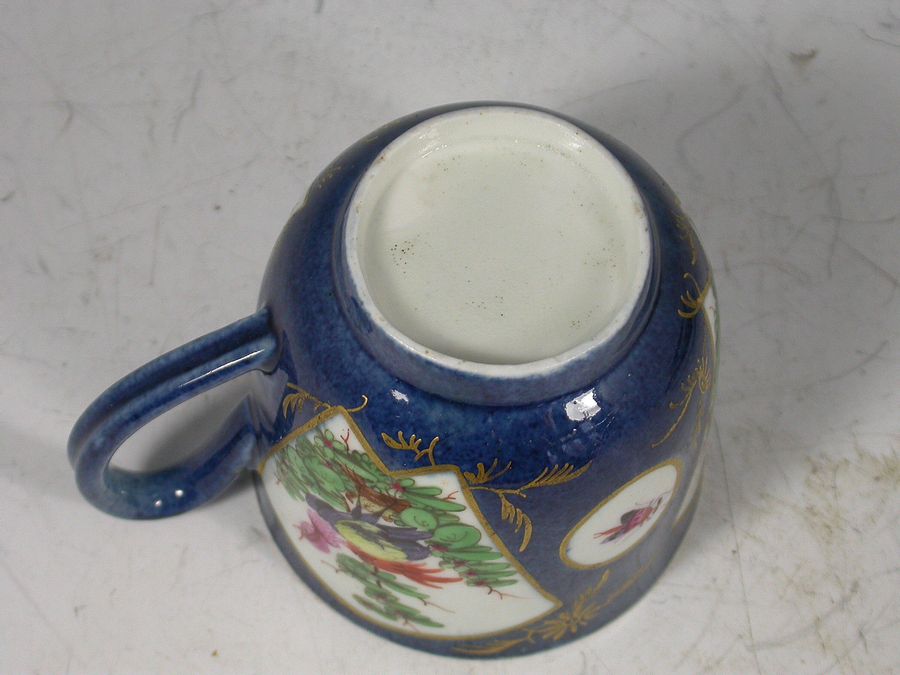 A fine Dr Wall Worcester Trio of Coffee Cup, Tea Bowl and Saucer, on gilt enriched powder blue ground, painted in the fan shaped panels with exotic birds in a landscape setting, alternating with circular reserves of insects, gilt line border.