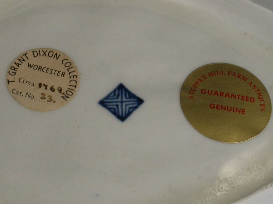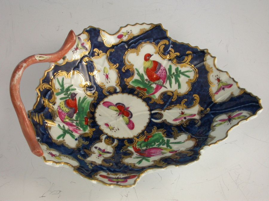 A very fine Dr Wall Worcester Leaf Dish with twig handle, painted on a scale blue ground, the gilt enriched vase and mirror shaped reserves painted with exotic birds and insects.