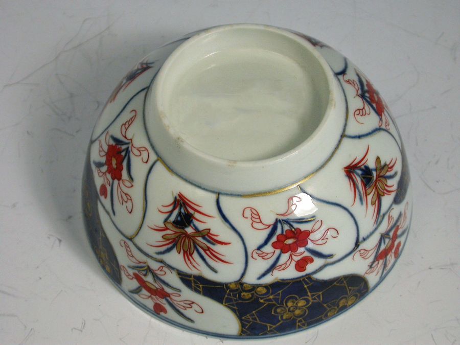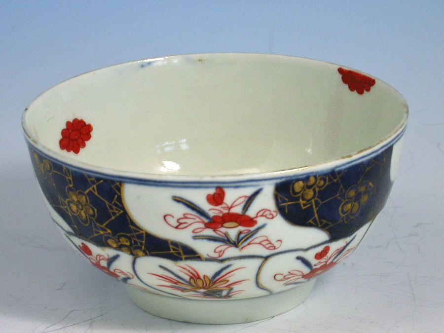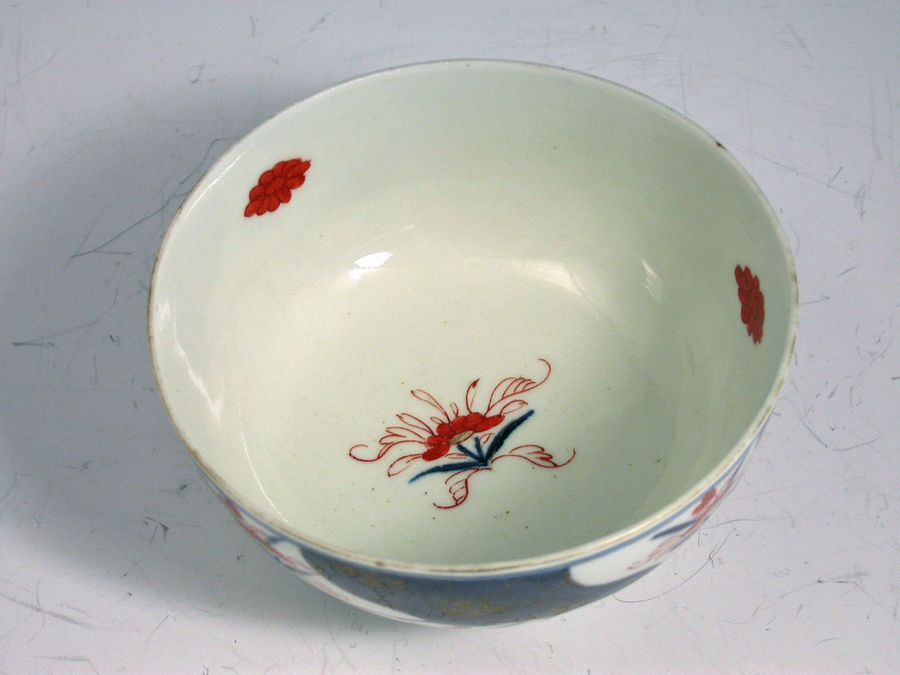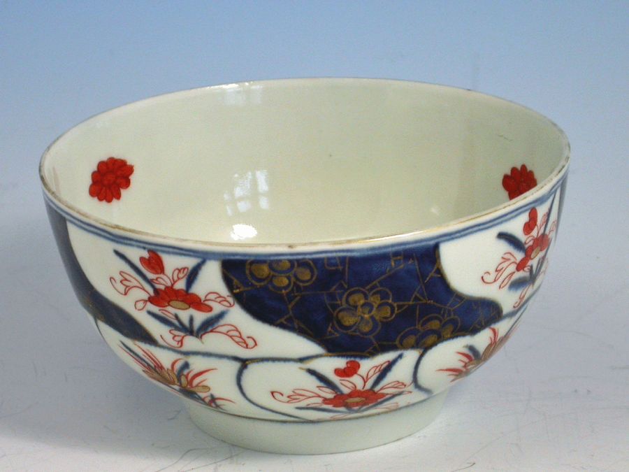 A fine Dr Wall Worcester Slop Bowl of small size, painted in Japanese Imari style in order to compete with the contemporary Chinese examples of the period, with blue reserves enriched with trailing gilt flower sprays alternating with Imari foliate sprays, the interior with individual iron red mons.