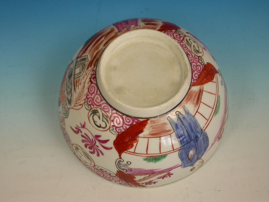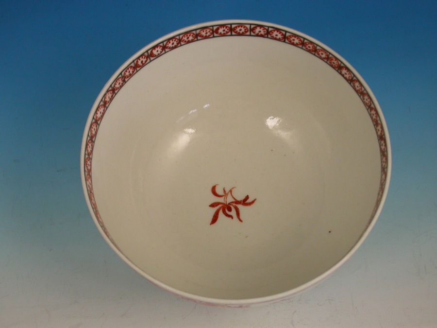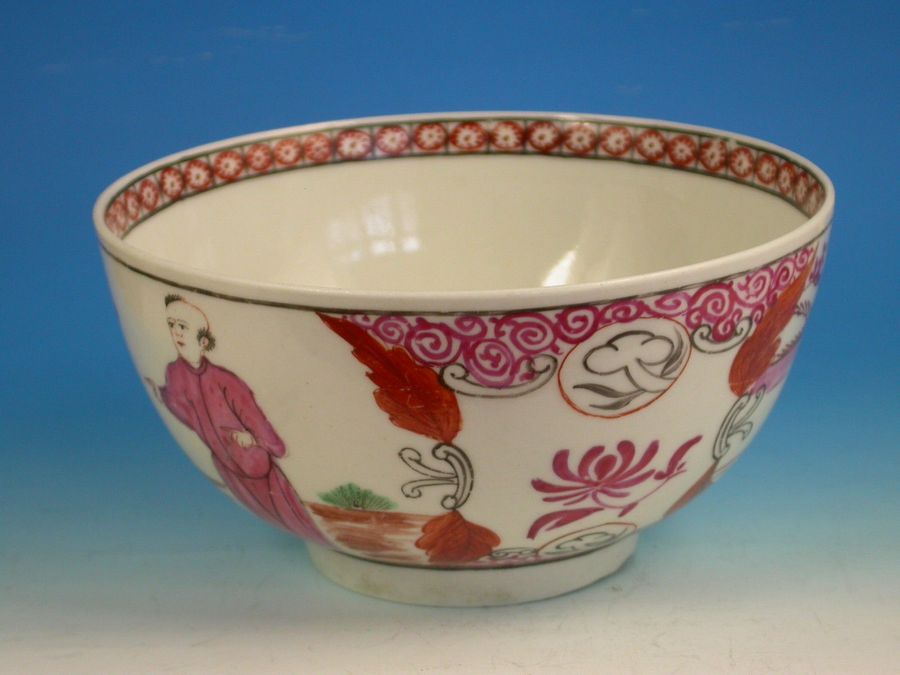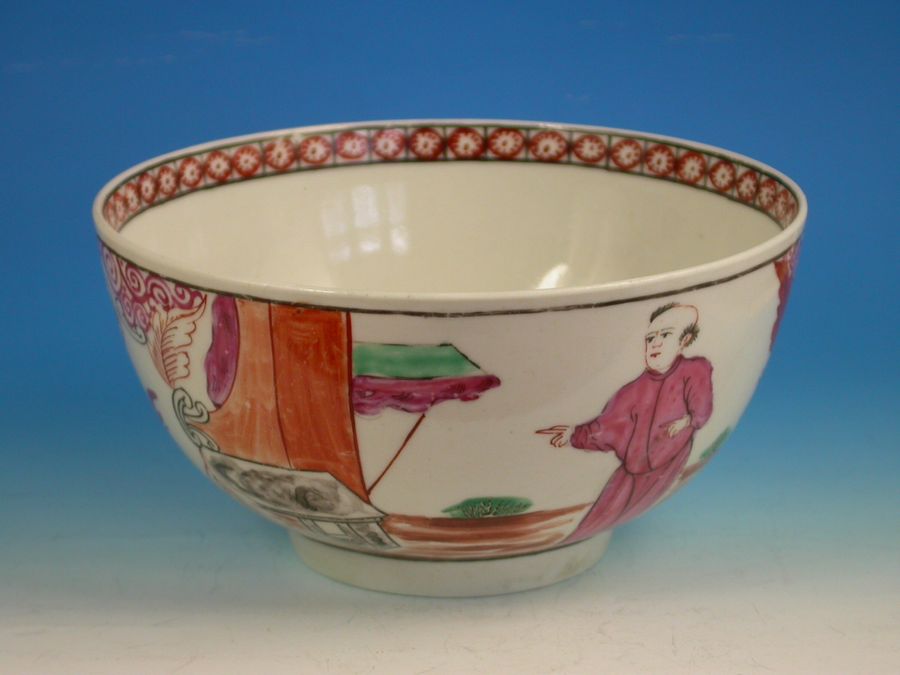 A fine and rare Dr Wall Worcester Slop Bowl of small size, painted in Chinoiserie style with a large Chinese gentleman standing on a balcony overlooking an island scene and another Chinese gentleman pointing to the interior of a house, all within iron red dot border.
