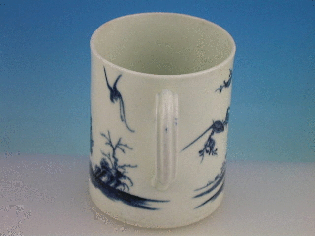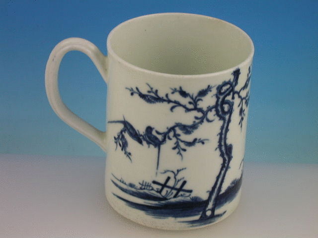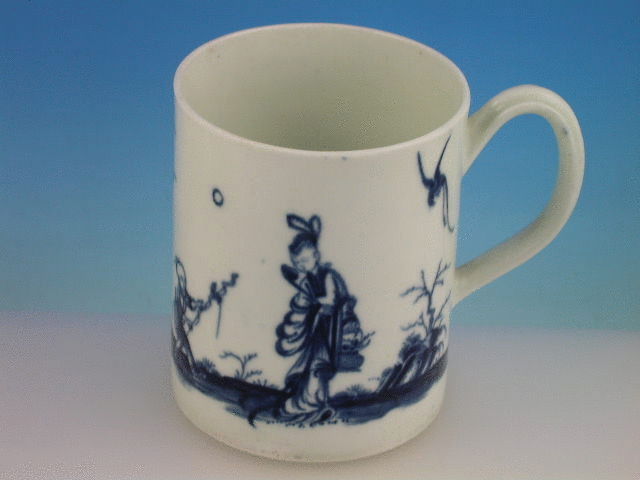 A good Dr Wall Worcester cylindrical Tankard with strap handle, painted in underglaze blue with the so called “Walk in the Garden” pattern, depicting a Long Eliza figure holding a basket of flowers standing in an oriental garden with a small boy holding a stick with a tethered bird and a knarled tree in the background. c1768.