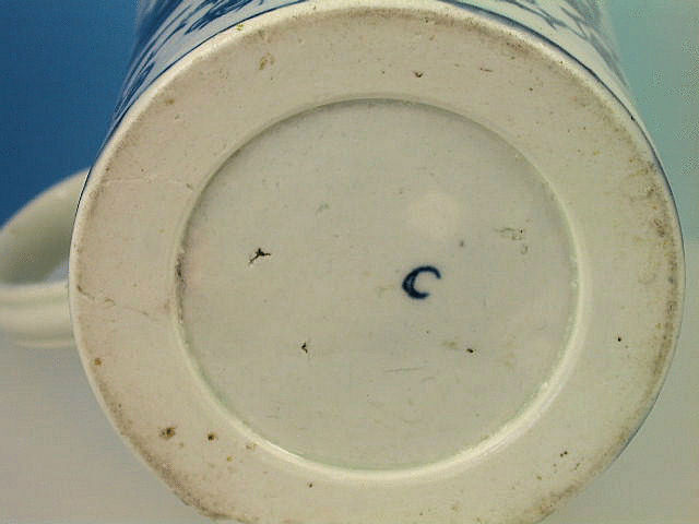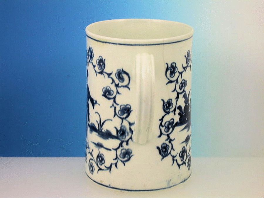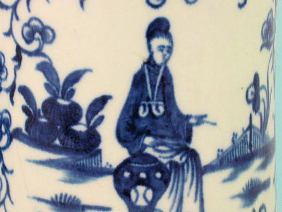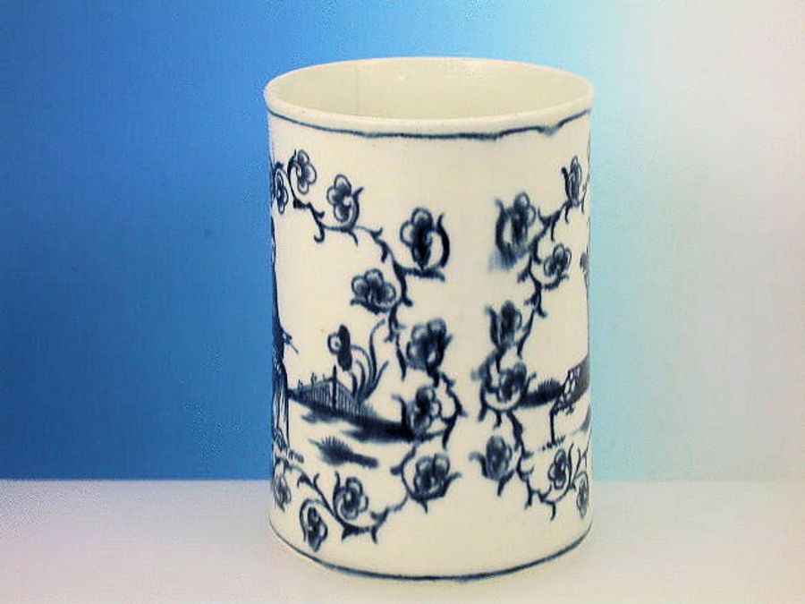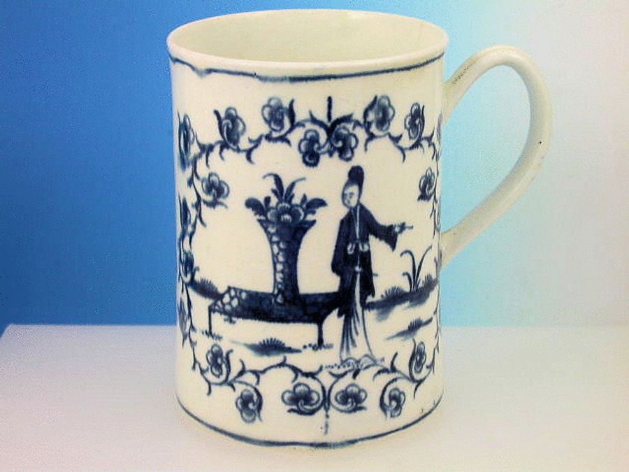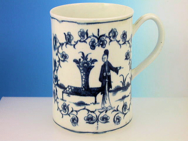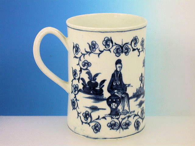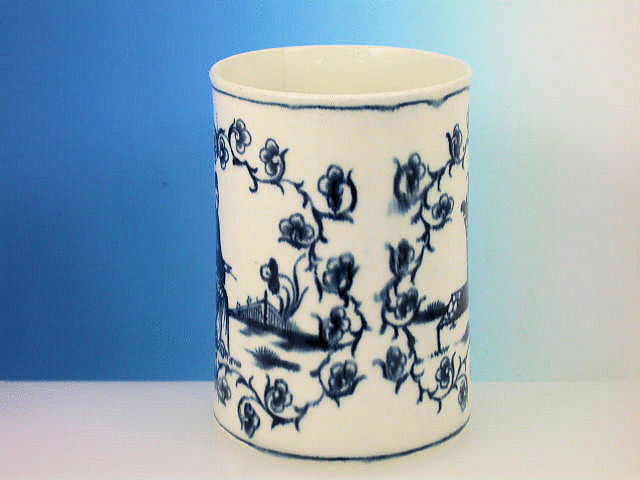 An extremely rare Dr Wall Worcester cylindrical Tankard with grooved strap handle, painted in underglaze blue with the ‘Floral Reserve pattern’ (BFS IA15) depicting a Chinese Lady seated by a large vase in a fenced garden within a trailing garland of flowers, and another standing by a table with a large vase of flowers on it.