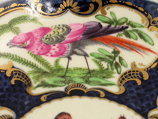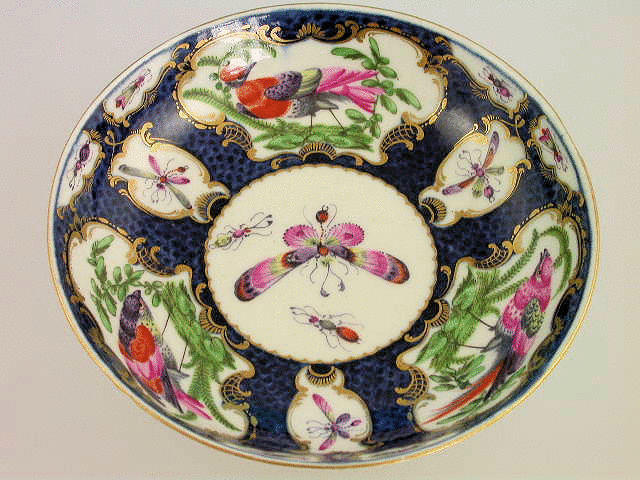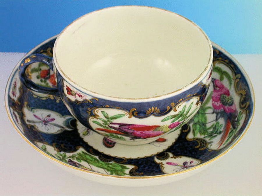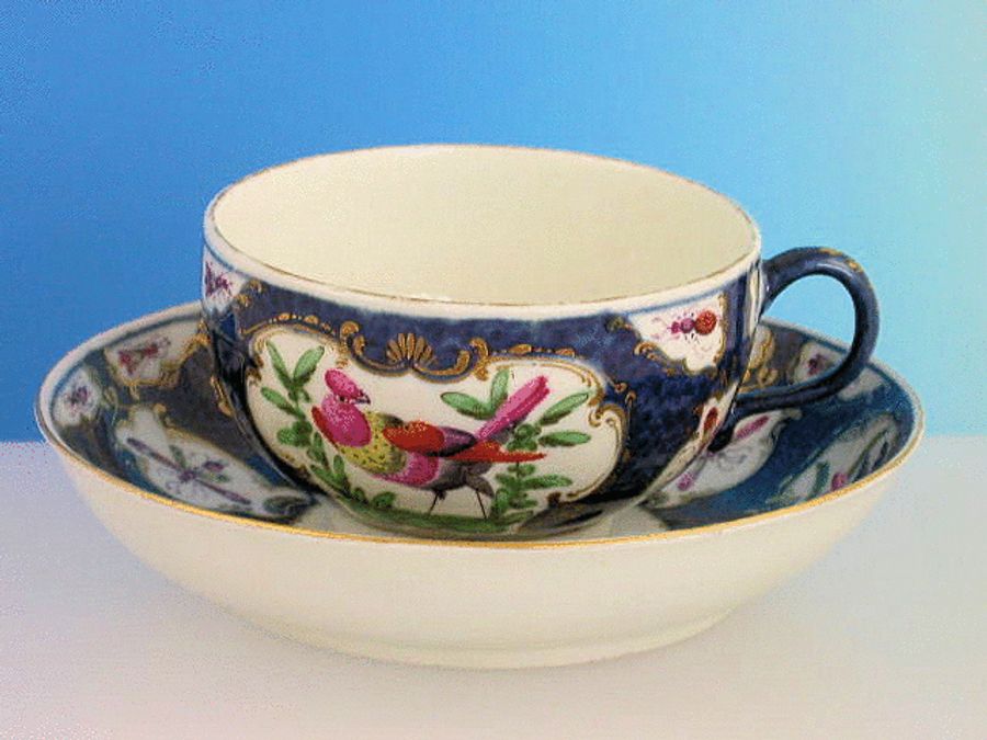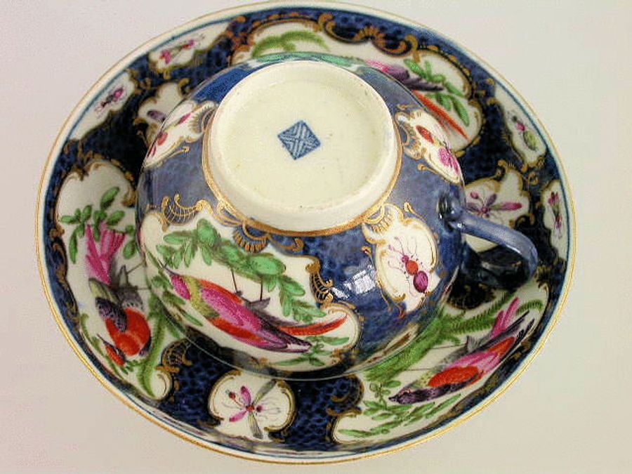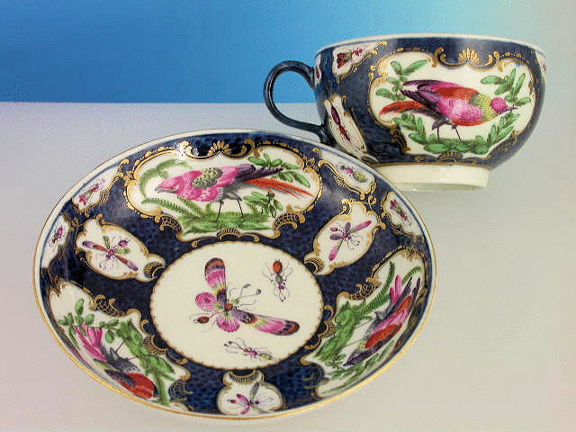 A fine Dr Wall Worcester Tea Cup and Saucer with solid loop handle, painted in the vase and mirror shaped reserves with exotic birds in landscapes, moths and insects, on a scale blue ground, gilt lined rims. c1768.