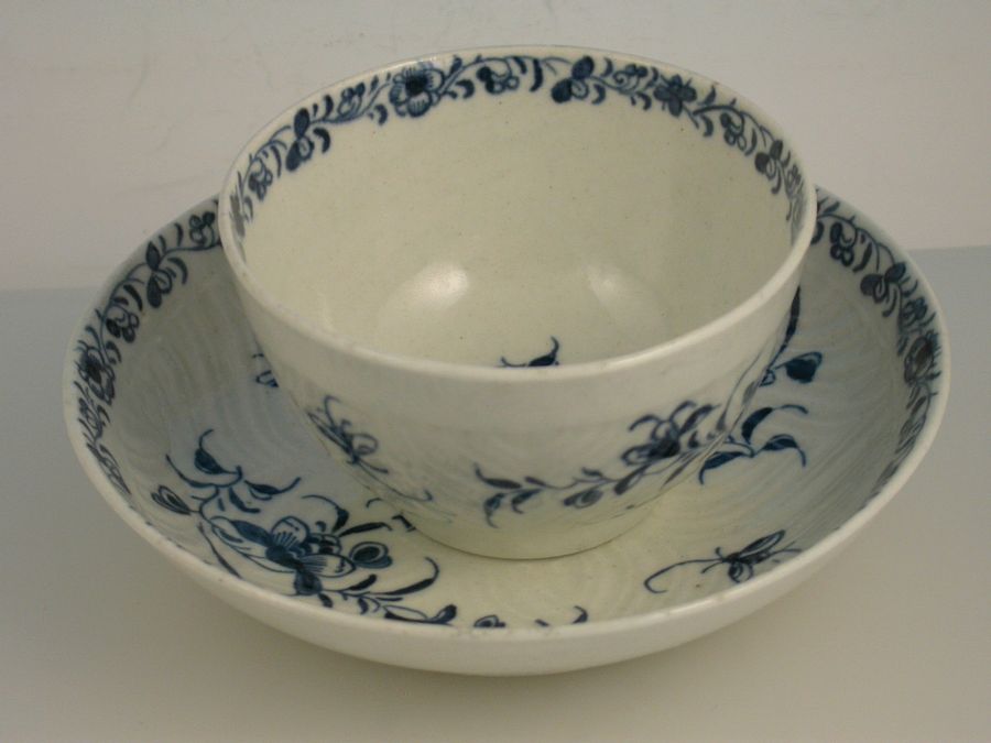 A fine Dr Wall Worcester Teabowl & Saucer of feather moulded form, painted in under-glaze blue with “The feather mould floral pattern” (IE6 in BFS Worcester Blue and White Porcelain).