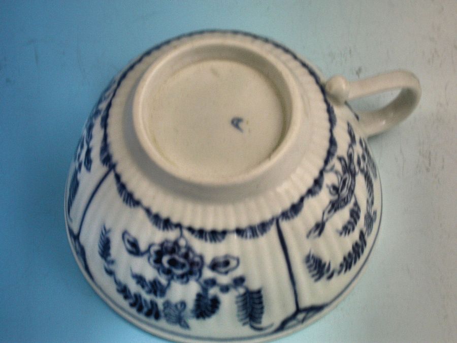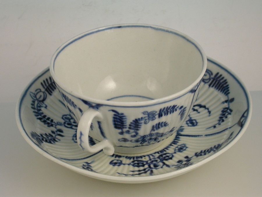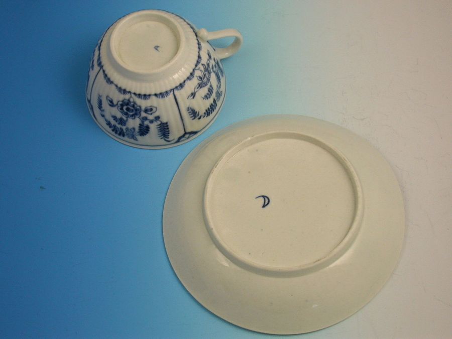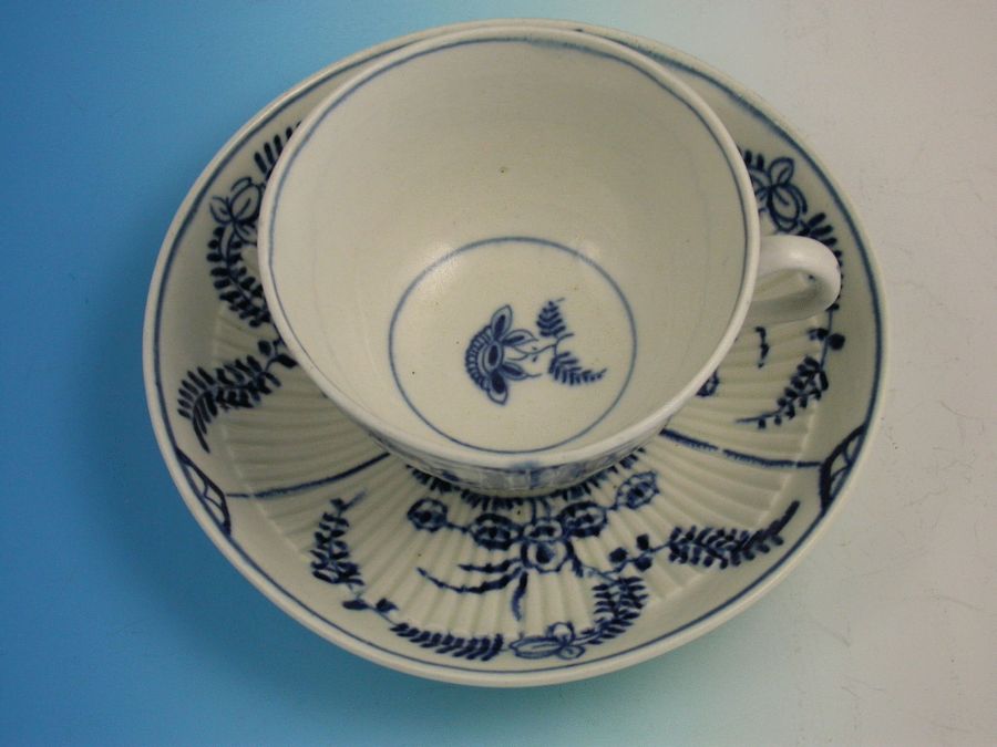 A fine Dr Wall Worcester Teacup & Saucer of press moulded form, painted in under-glaze blue with “The Immortelle pattern” (IF10 in BFS Worcester Blue and White Porcelain).