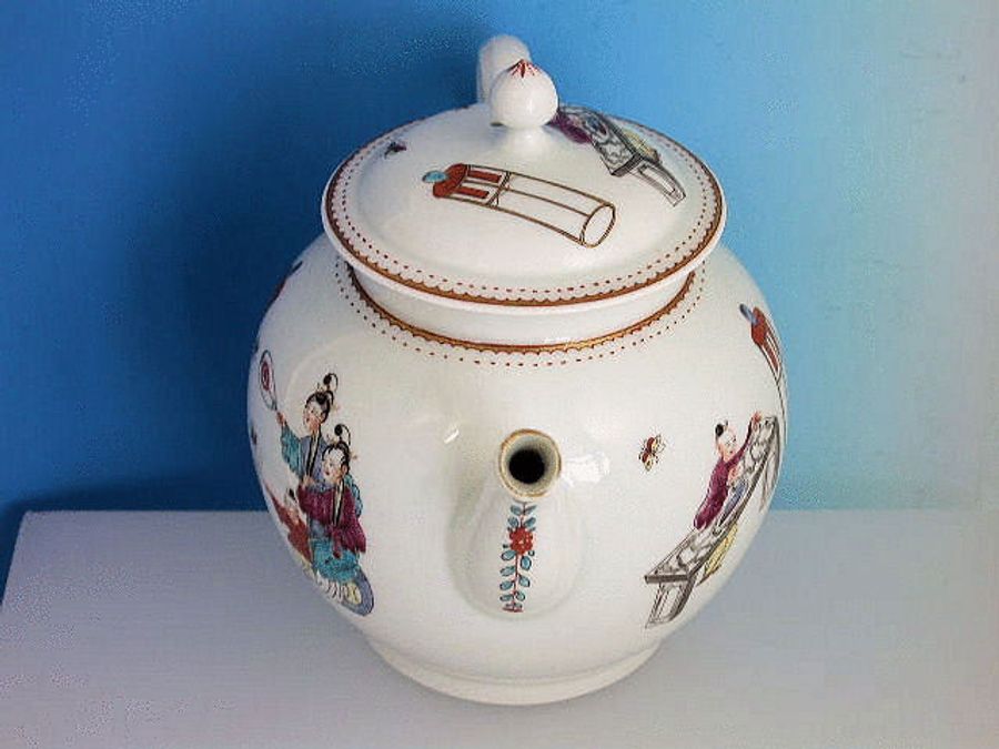 A fine Dr Wall Worcester globular Teapot and Cover with acorn knop, curved spout and solid loop handle, painted in polychrome enamels with the ‘Chinese Family’ pattern.