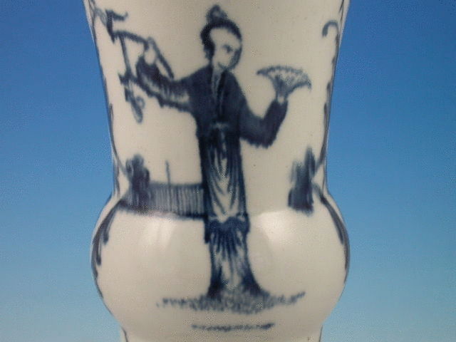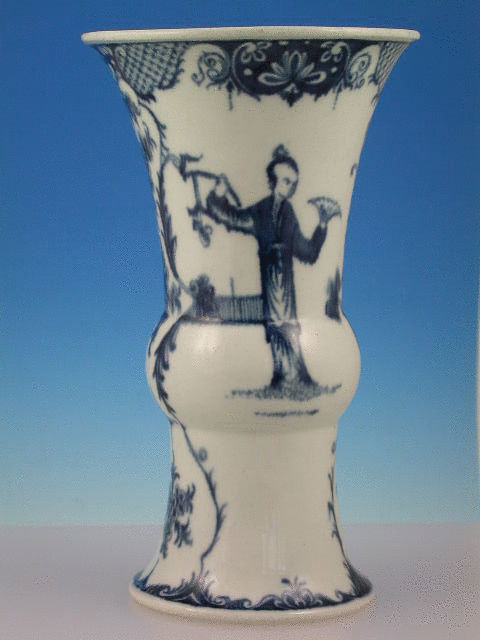 A good Dr Wall Worcester flared trumpet shape Vase, painted in underglaze blue with Long Eliza figures within pineapple cross hatched and scrolled borders.